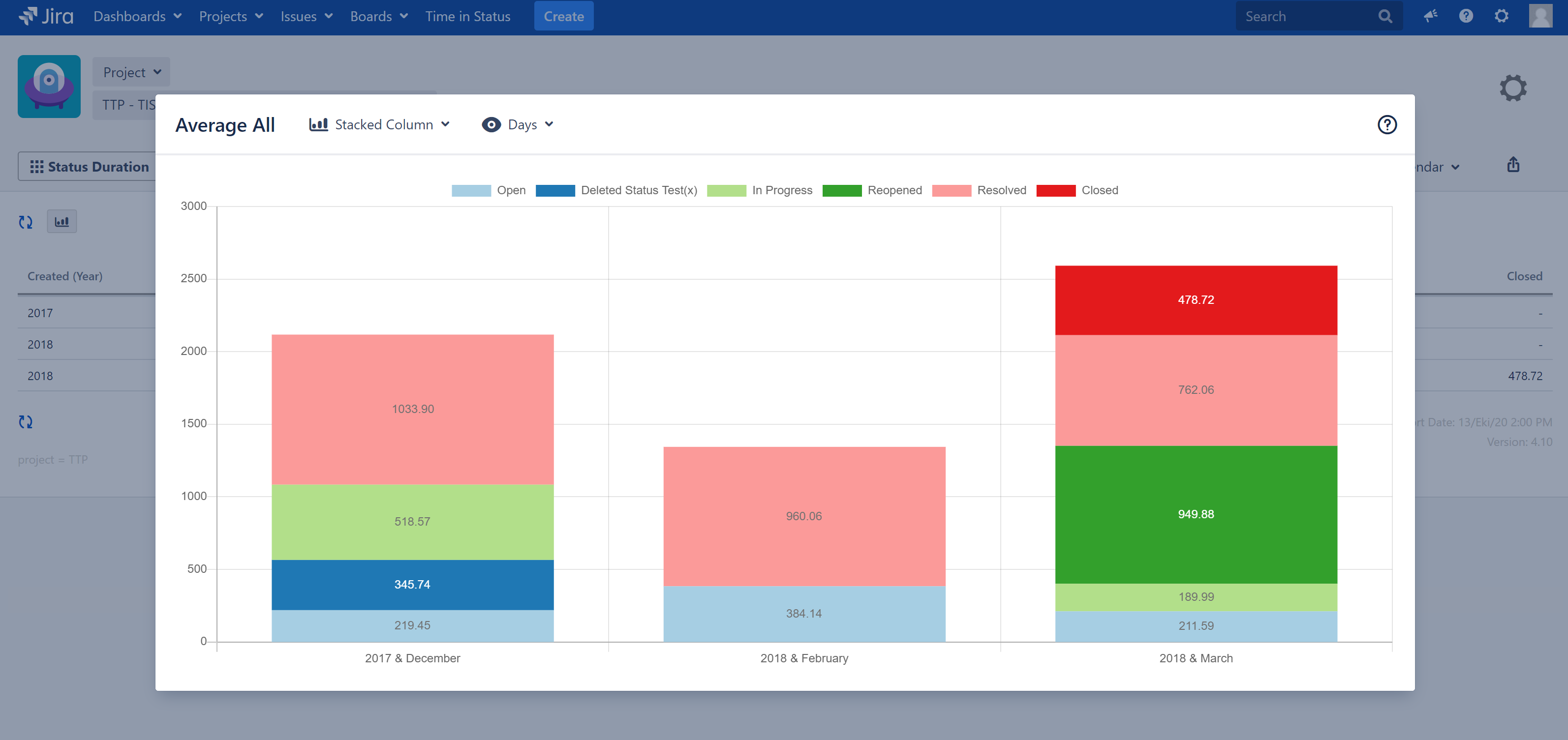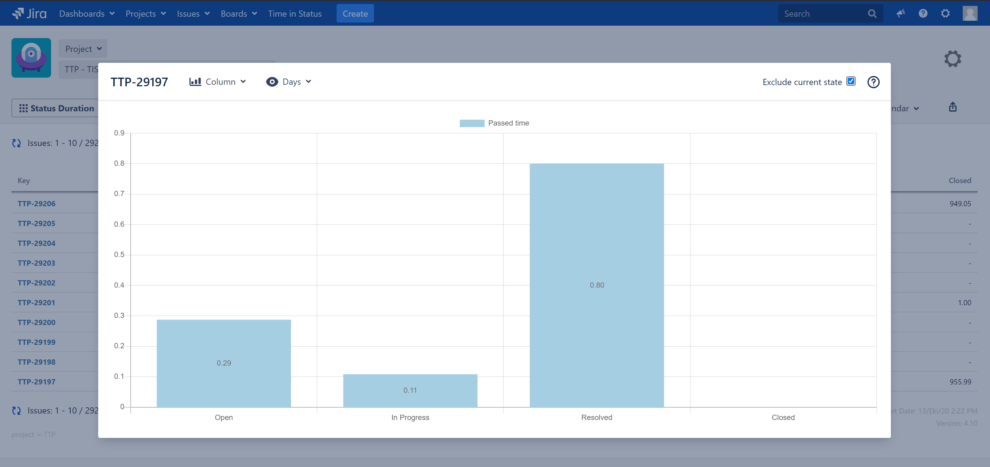 Please note that Exclude Current State does not exclude the latest status completely but rather excludes the duration since the latest status/assignee change in issue history. If the issue has visited Closed status more than once, the Closed column will still display a value grater than zero when Exclude Current State is checked.