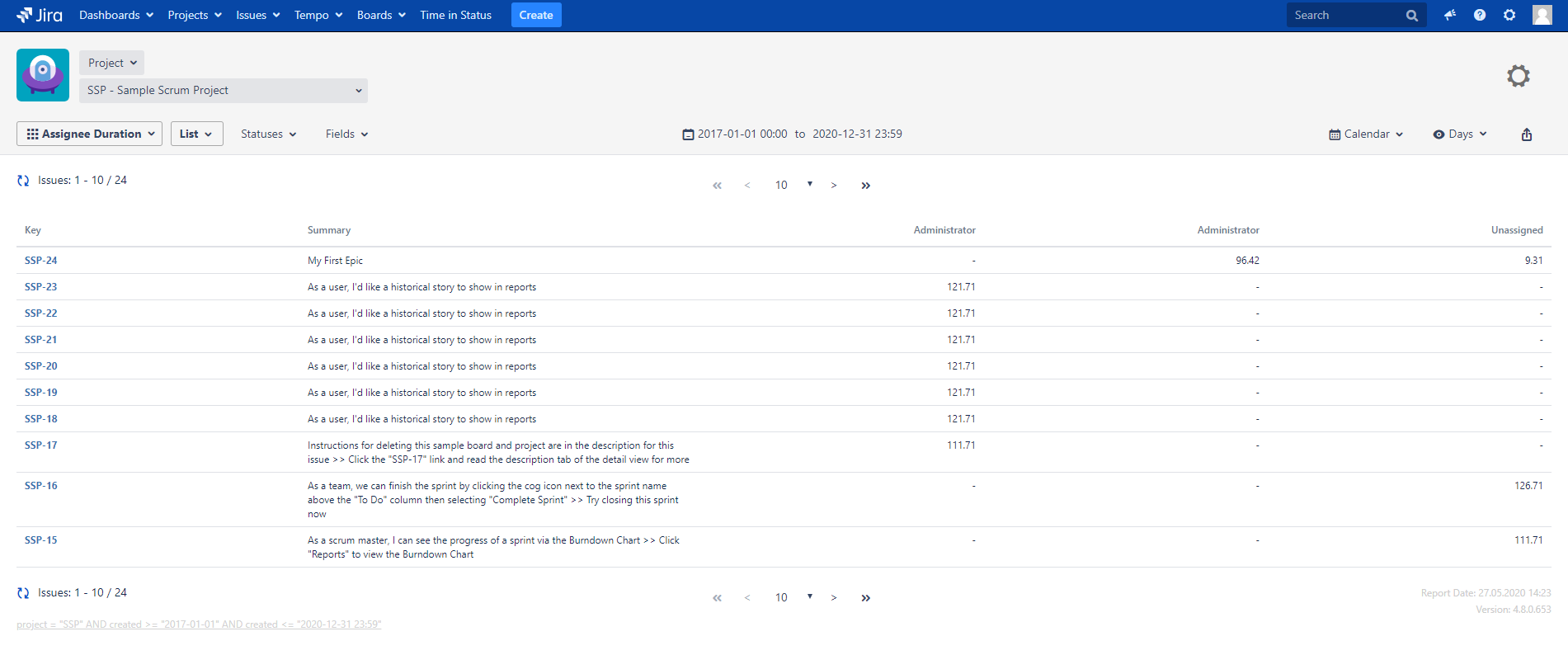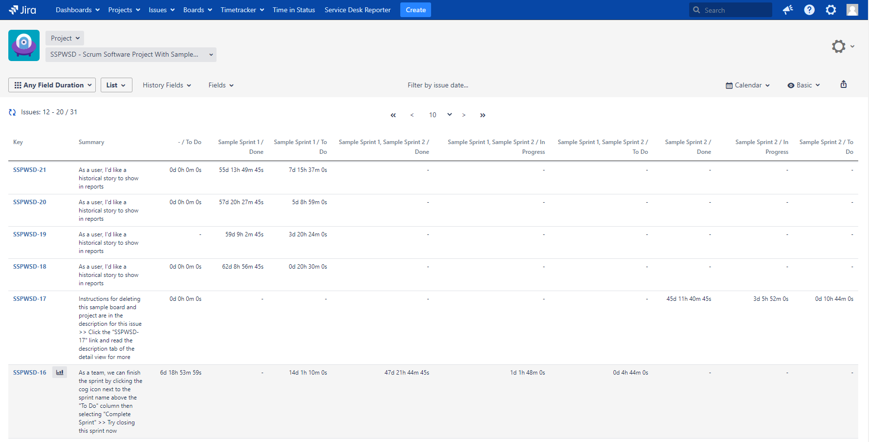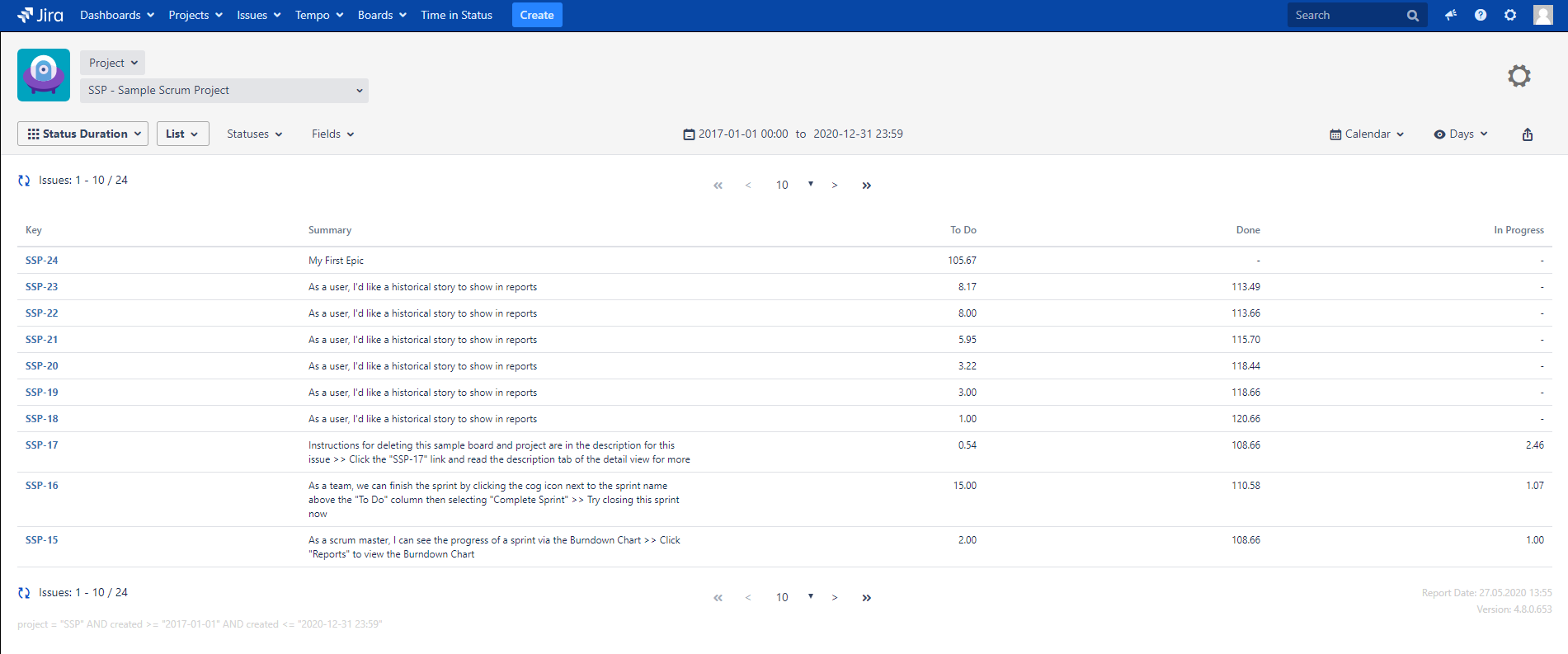 Status Duration in the older and the most commonly used of the report types. Status Duration Report lists each issue in rows with statuses as columns and the time that issue spent in that status as column values.