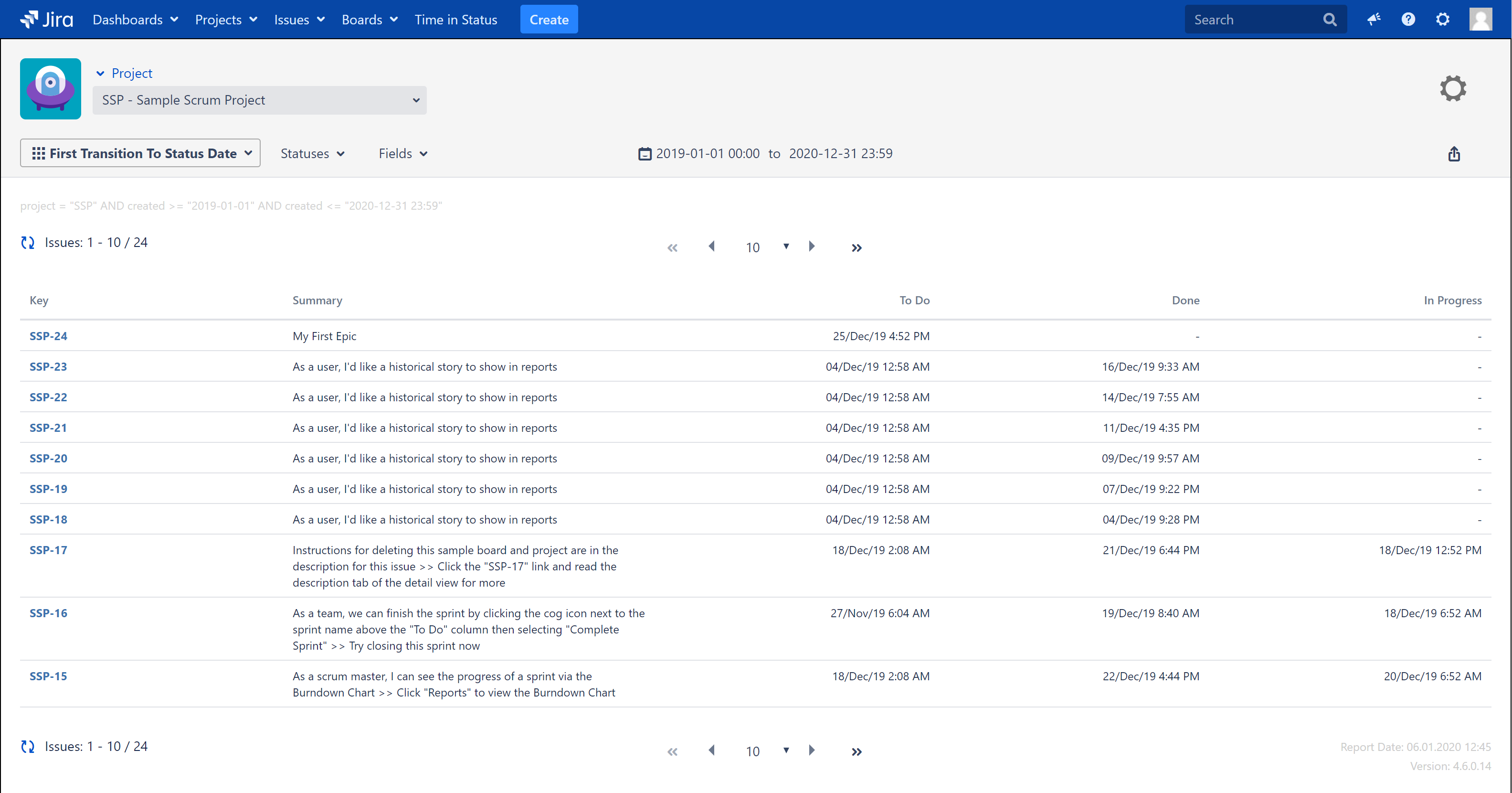 This reports helps you get the latest dates when issues were in a given status so you can compare them with your own targets like resolution times, close times etc. Especially useful if issues go back and forth between statuses.