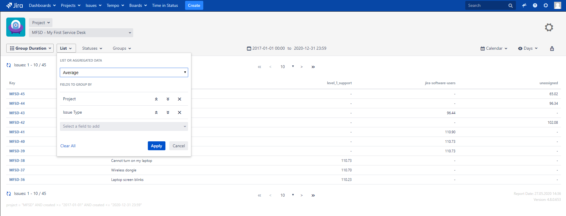 When you select the Average option, the panel will allow you to select and order issue fields. The averages displayed on screen will be grouped by the fields you pick.