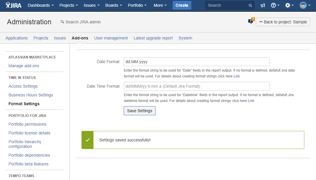- If no format string is given for one or both of the settings, the default JIRA date and datetime formats will be used. JIRA default format settings can be displayed and changed from "Look & Feel" JIRA administration page.