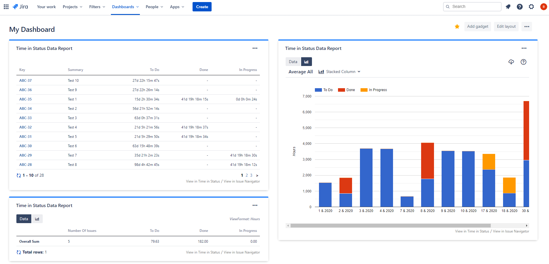 The Time in Status Report gadget allows you to display Time in Status reports as tables or charts on Jira dashboards.