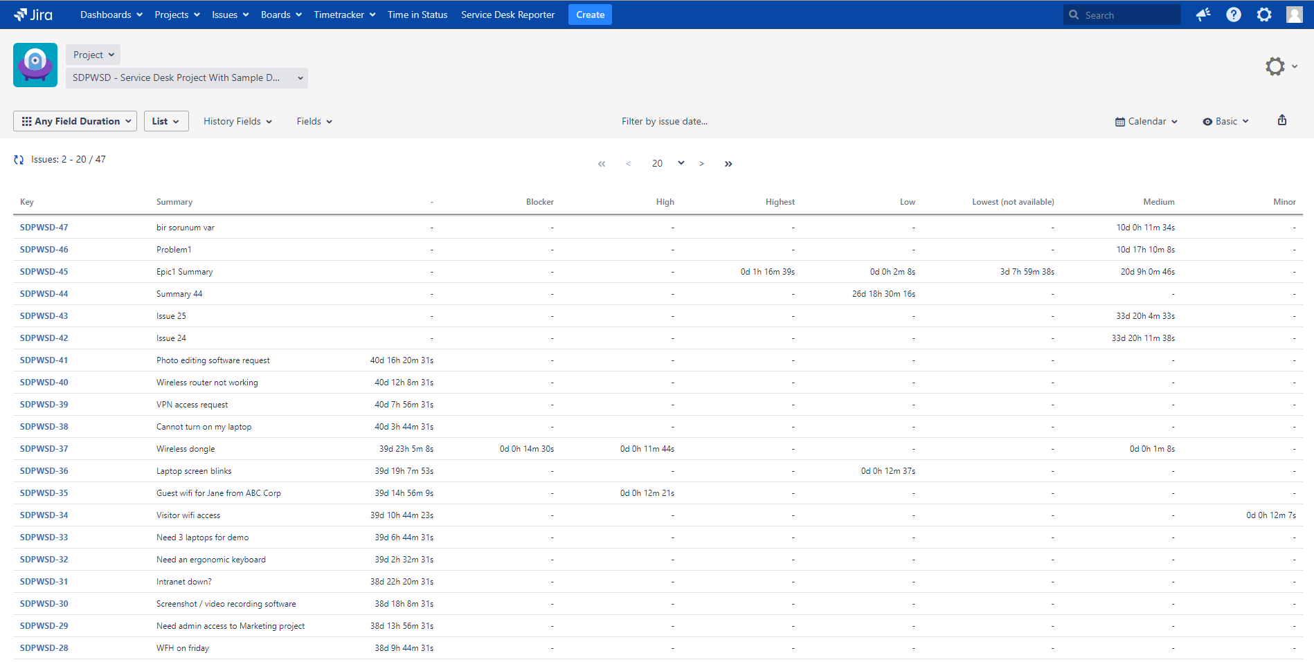 Any Field Duration Report is the most advanced report type for durations. It allows you to see how long each issue field held each value. It helps you identify many different wait times in issue workflow, without having to define a status for them.