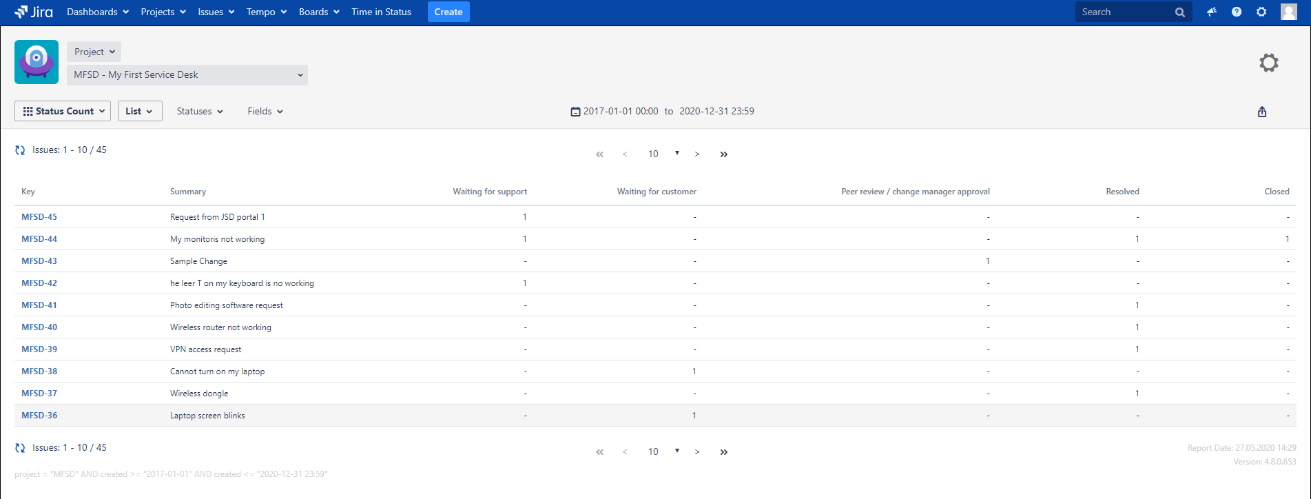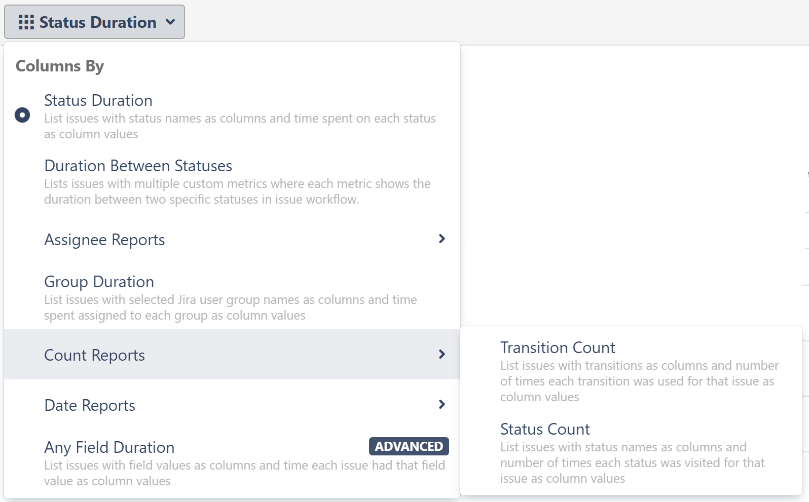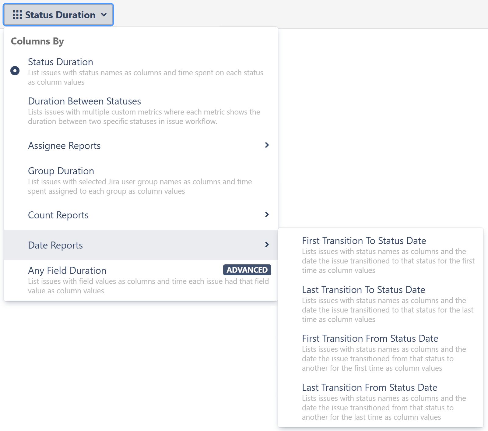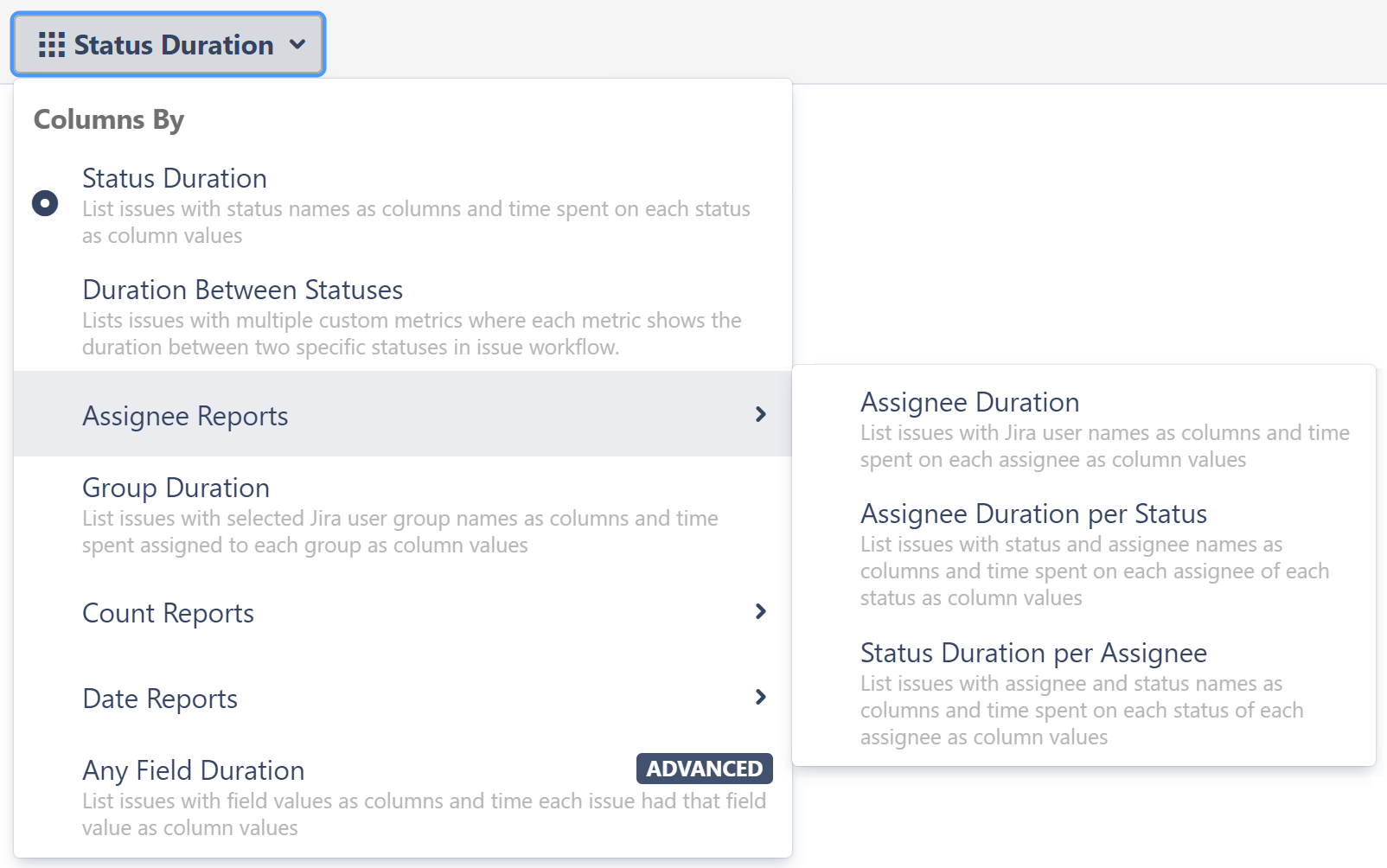 Status Duration in the older and the most commonly used of the report types. Status Duration Report lists each issue in rows with statuses as columns and the time that issue spent in that status as column values.