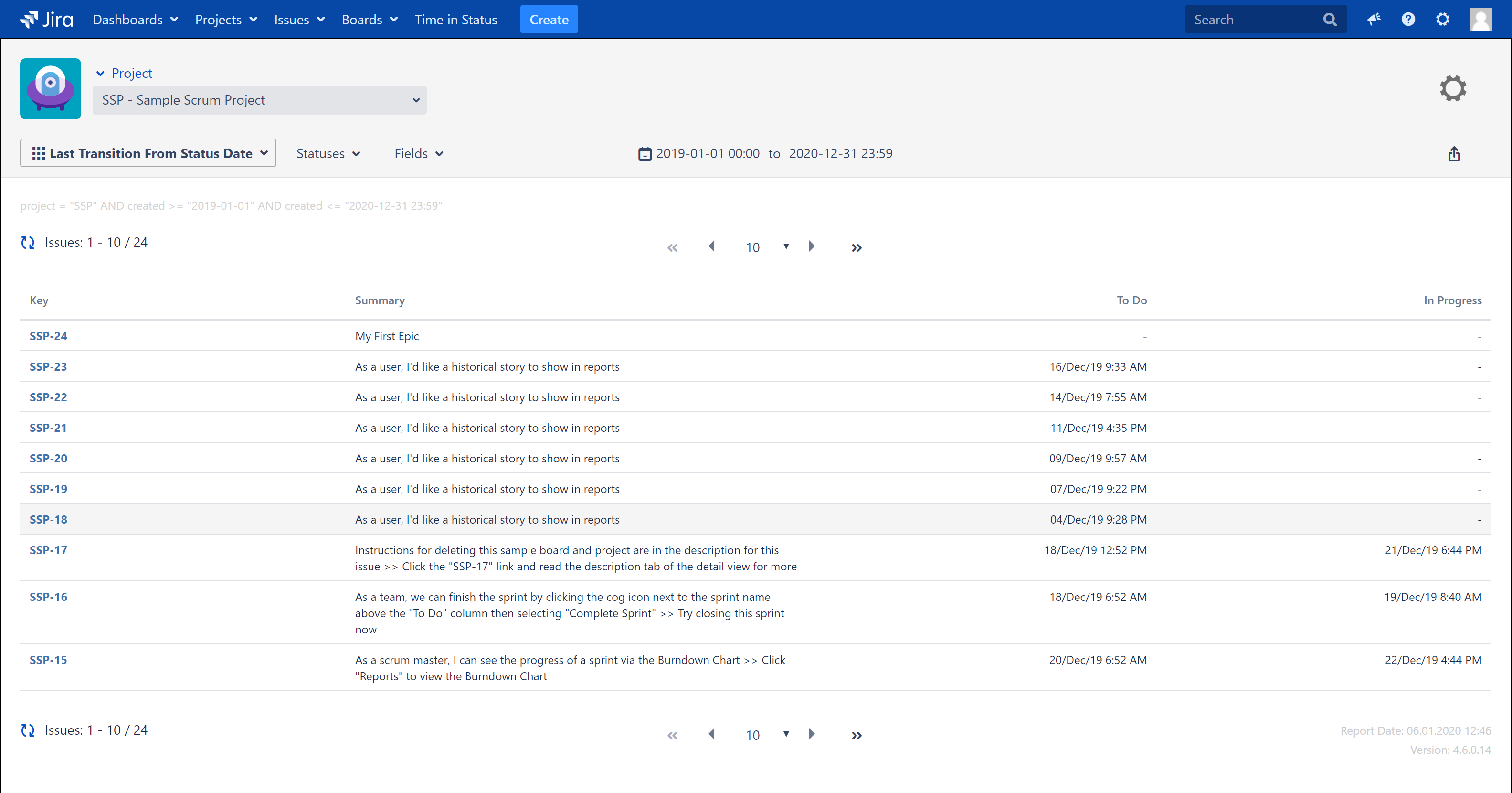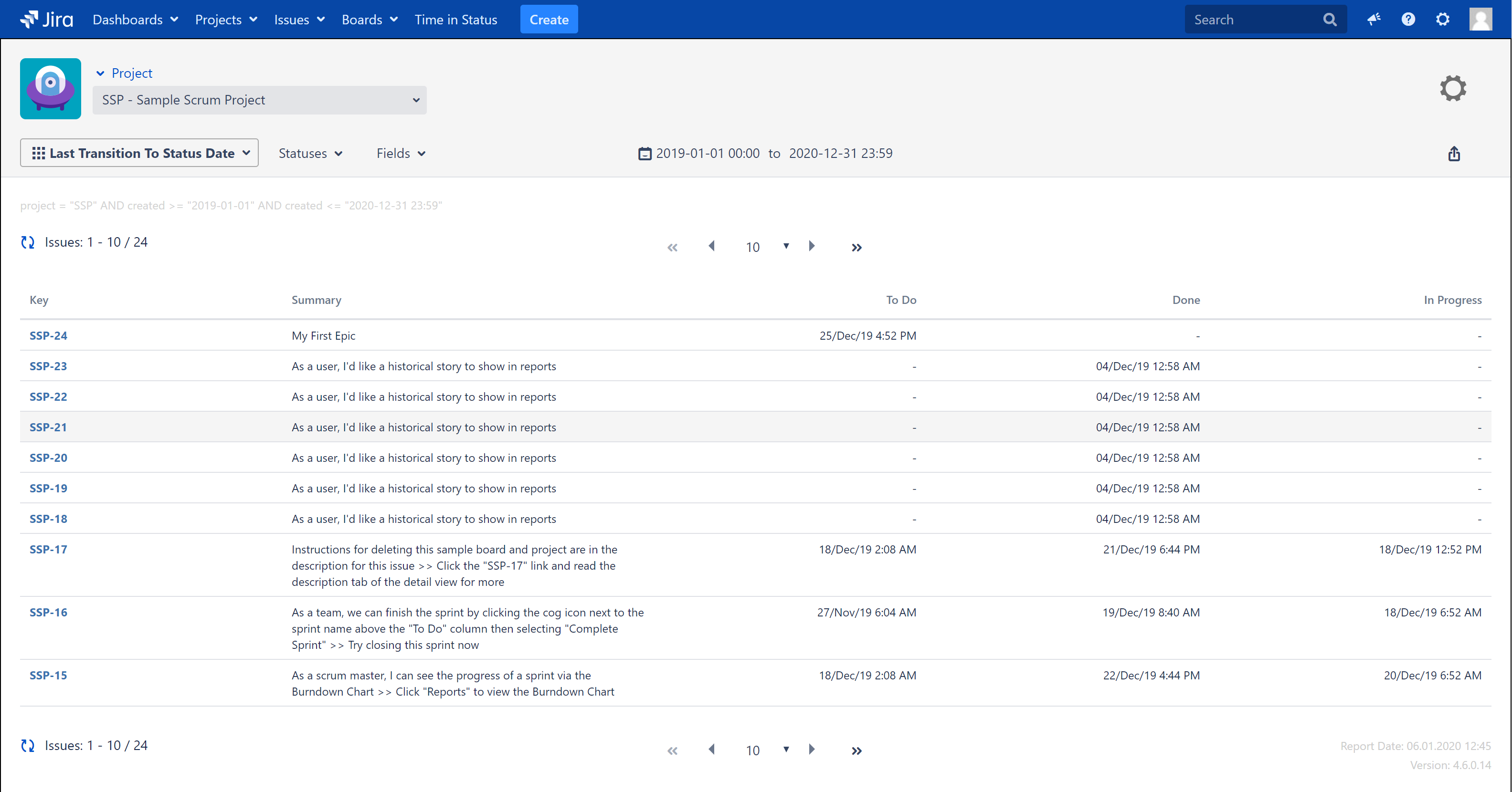 This reports helps you get the latest dates when issues were in a given status so you can compare them with your own targets like resolution times, close times etc. Especially useful if issues go back and forth between statuses.