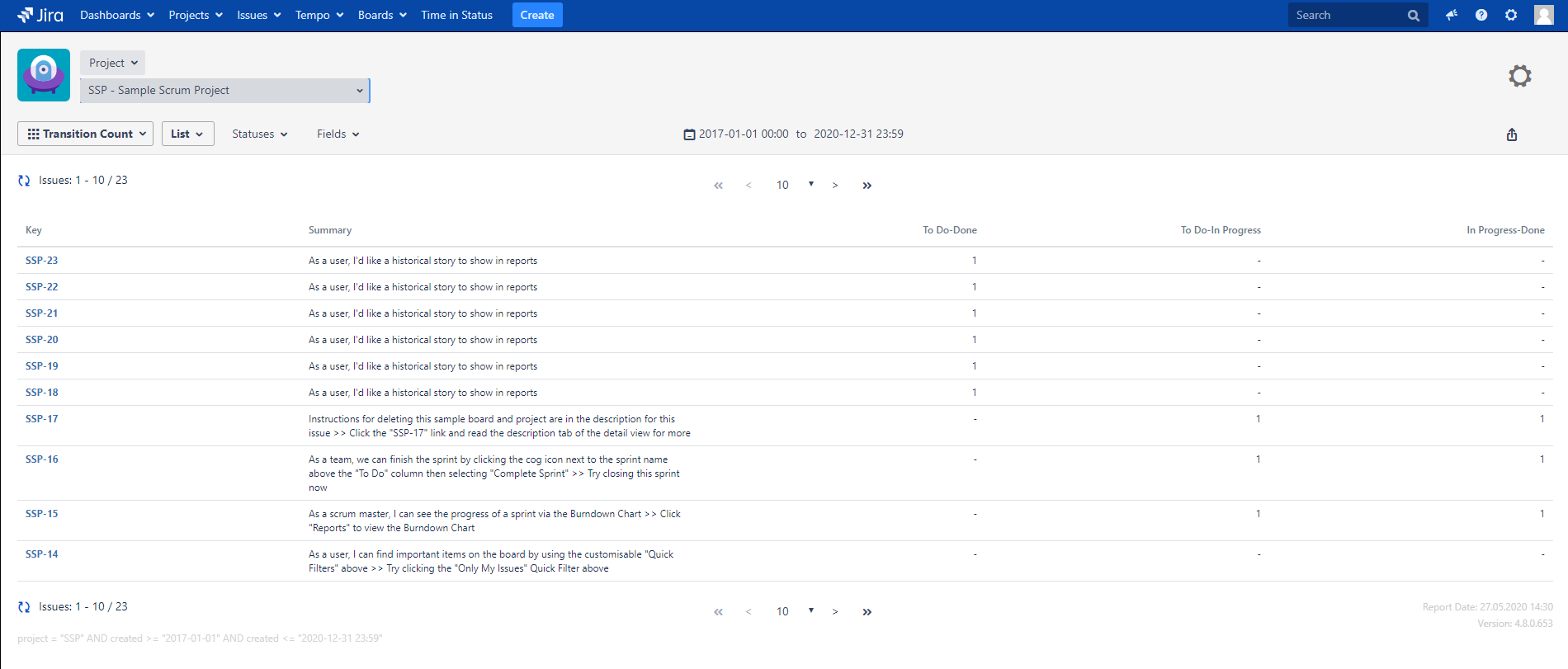 Transition Count Report lists each issue in rows with transitions as columns and the number of times that transition happened as column values.