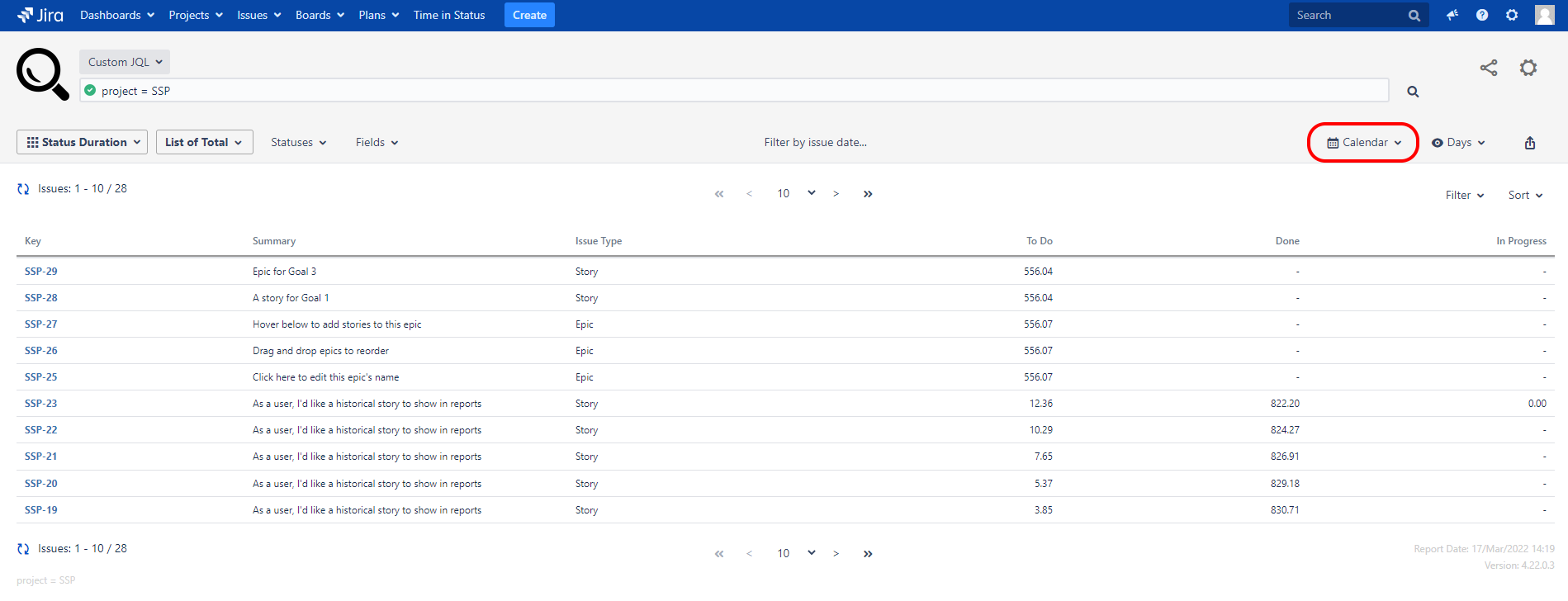 By default, the business hours calendar is set to work from 09:00 - 17:00 and weekends are non-working days. If an issue was transitioned to "In Progress" on Friday at 16:00 and was transitioned to "Done" on Wednesday of next week at 16:00, different values will show for different calendar types and view formats. (See View Format section below about View Formats)