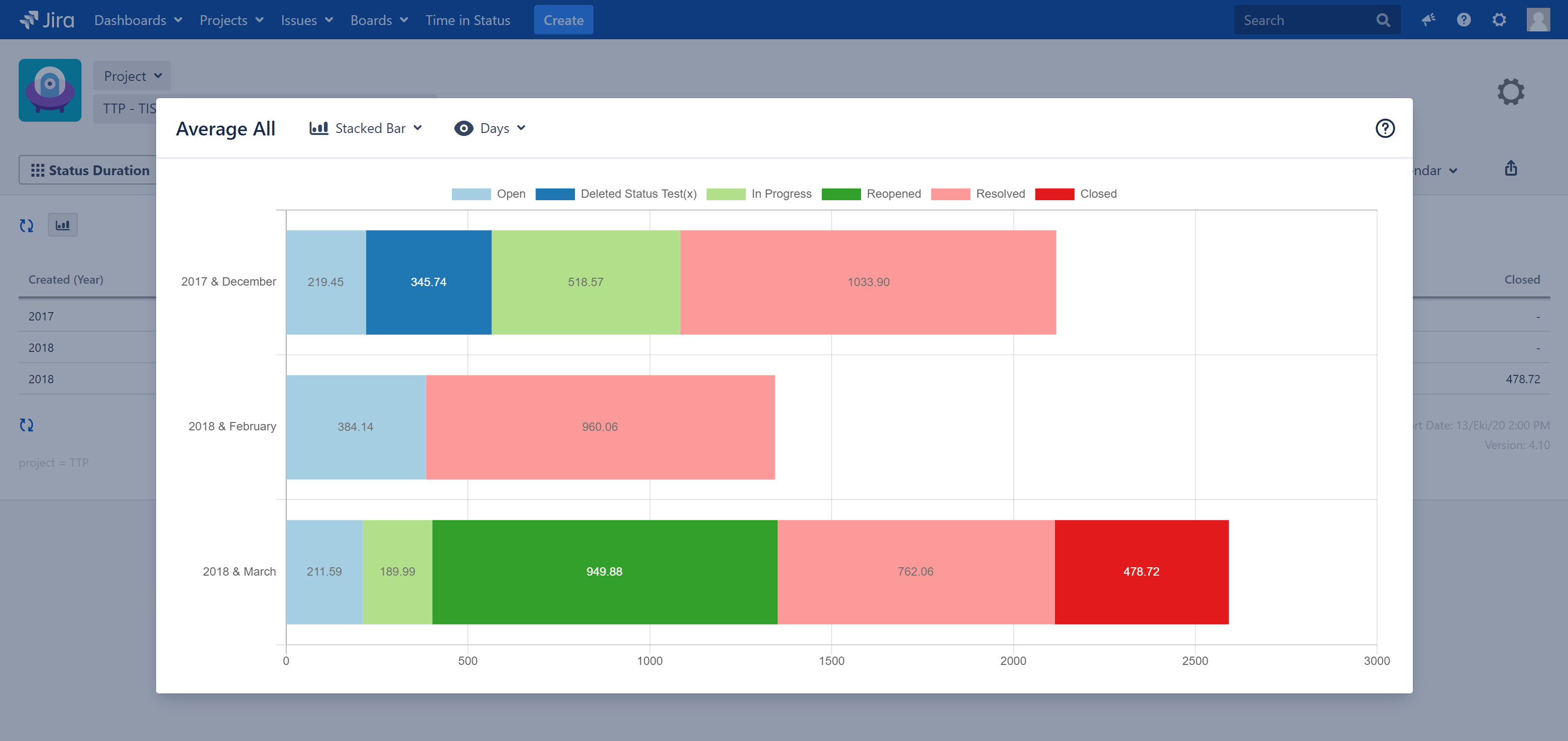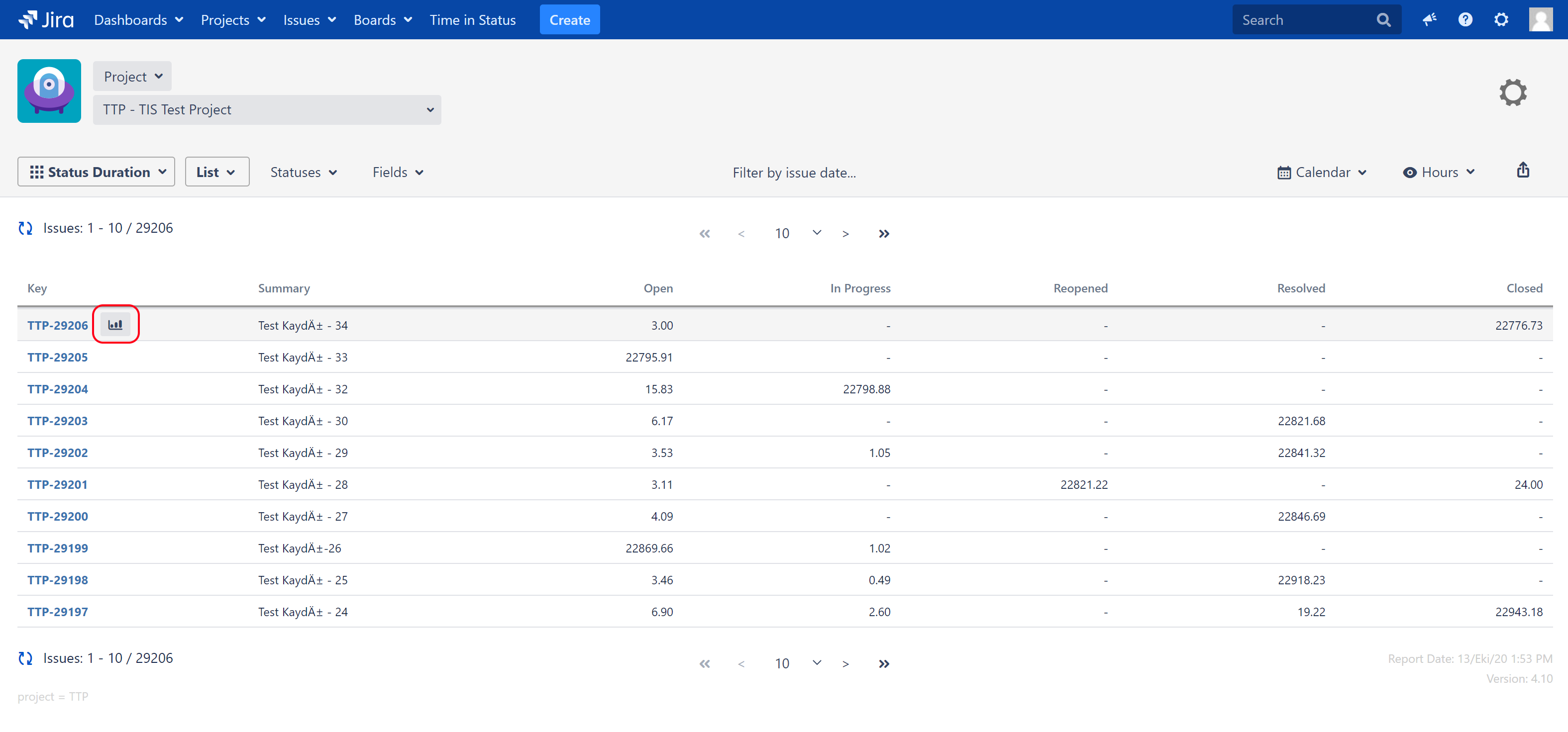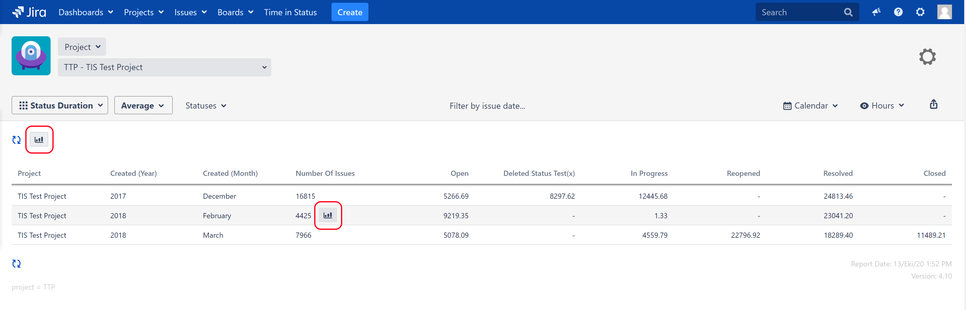 Time in Status report screen shows charts for individual report rows and an overall chart for aggreagated reports.