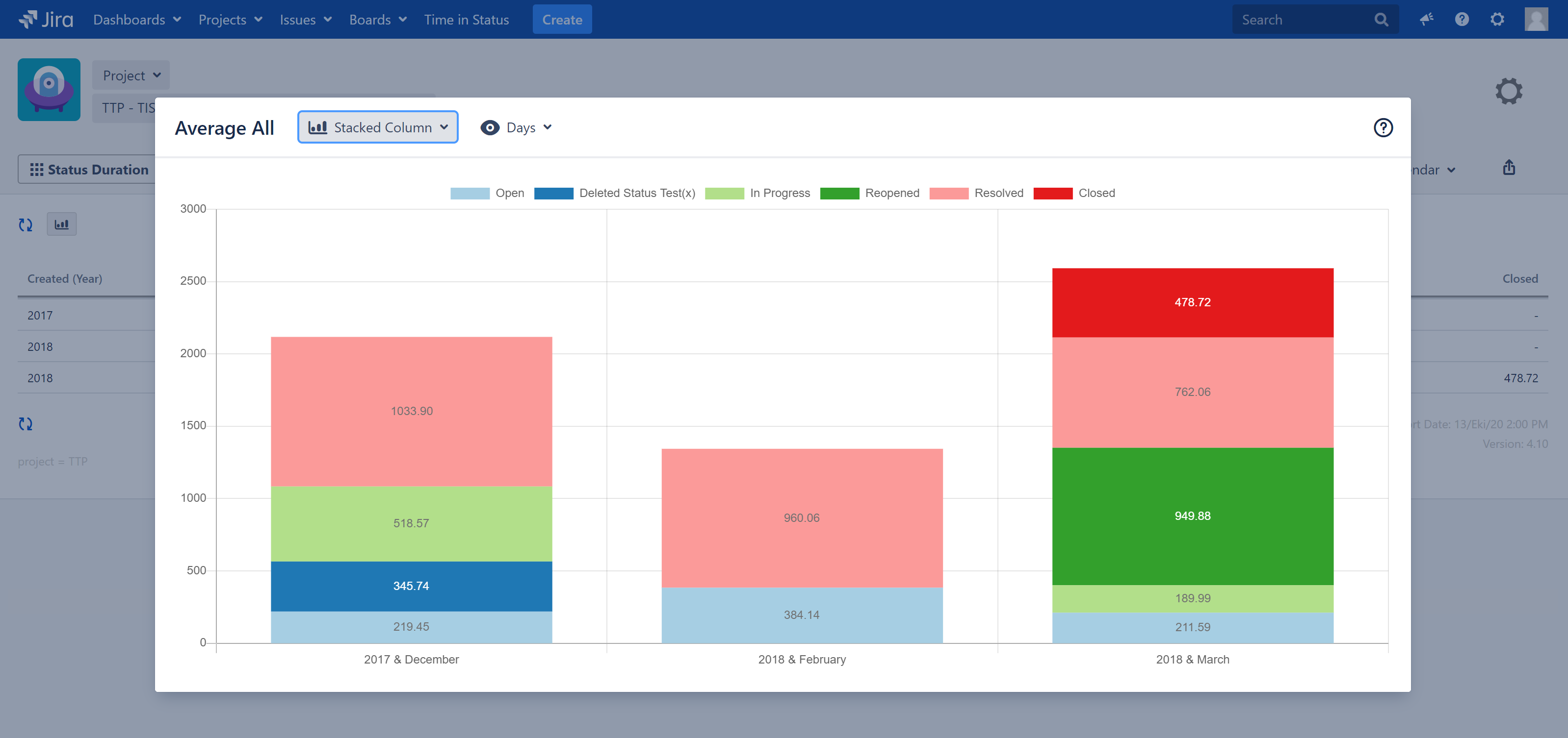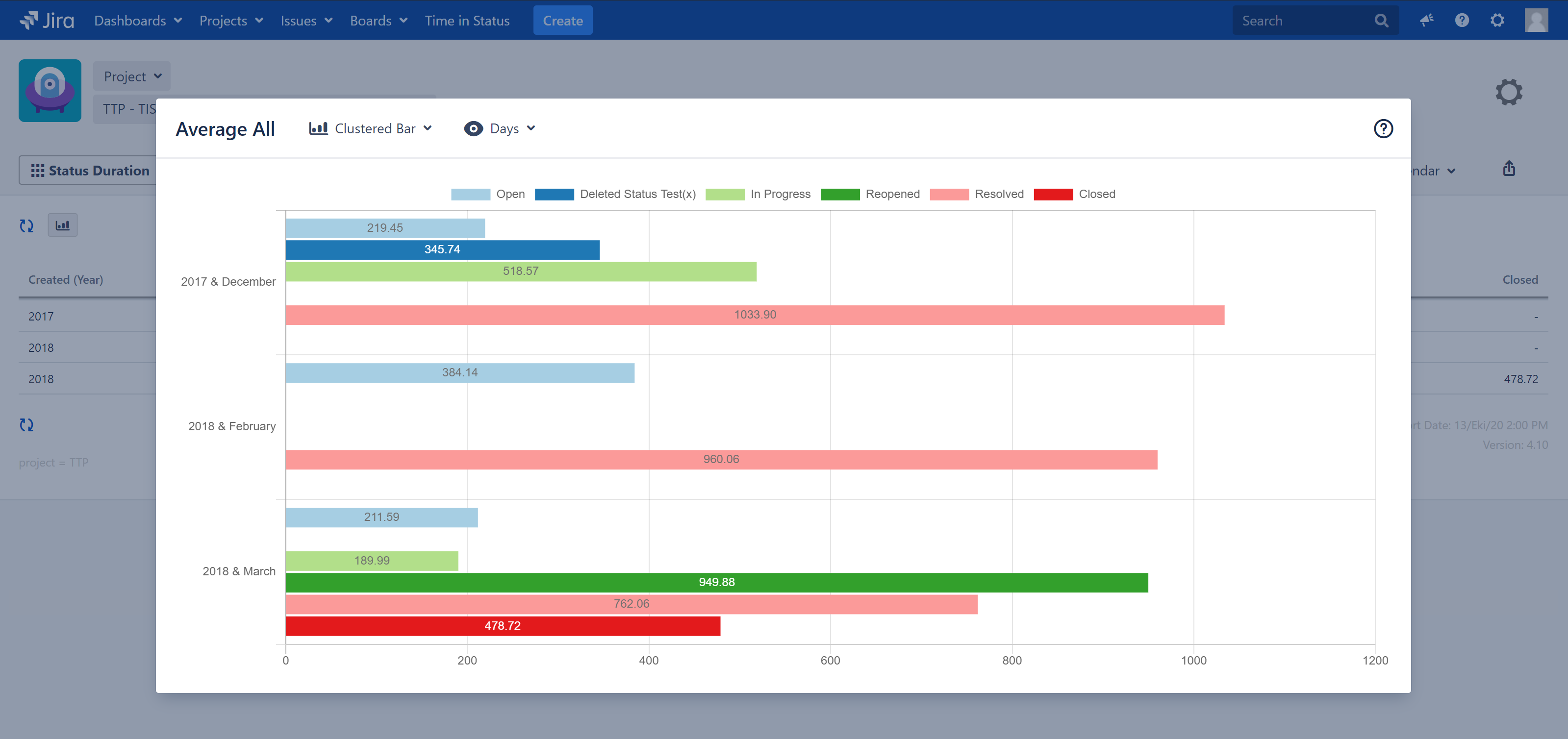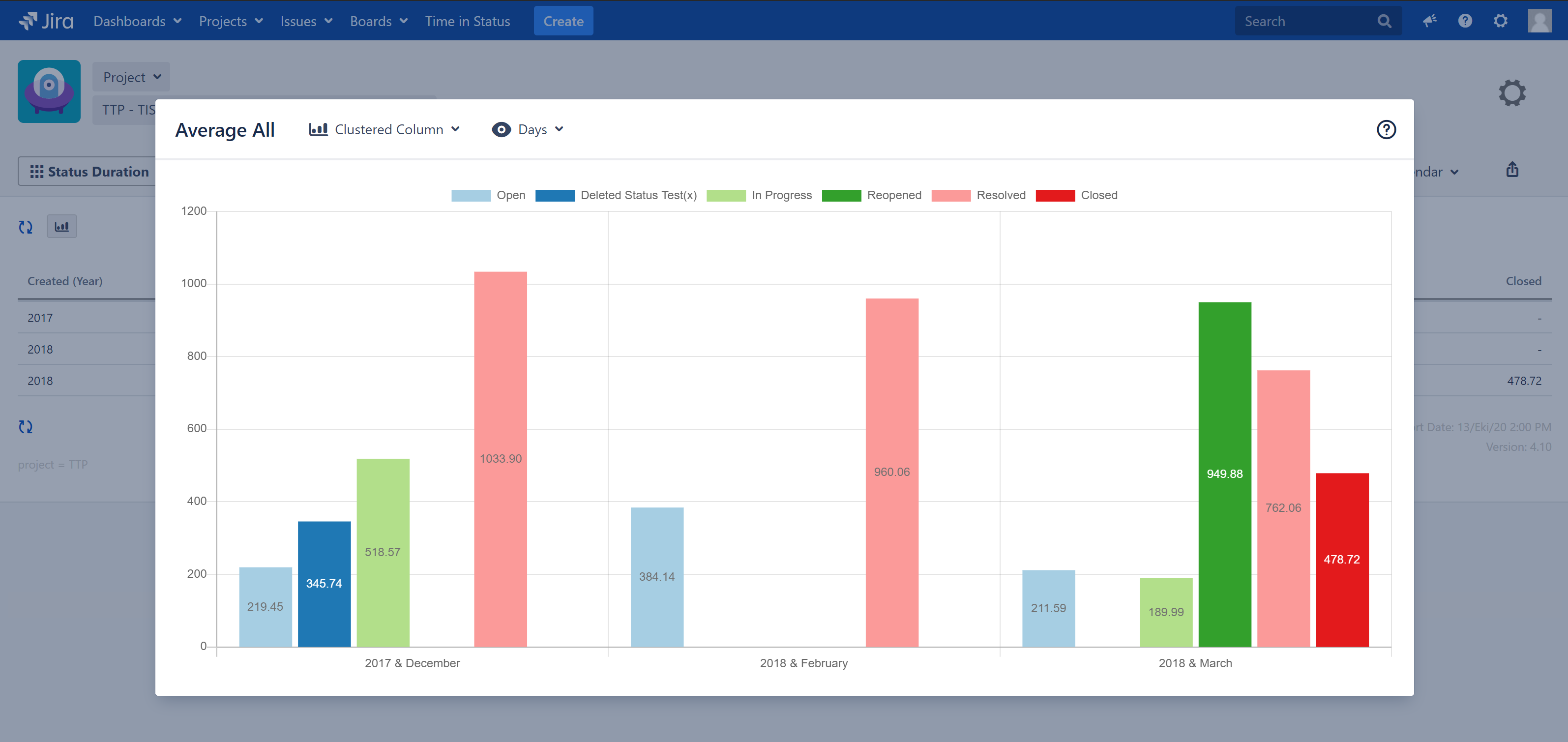 Time in Status report screen shows charts for individual report rows and an overall chart for aggreagated reports.
