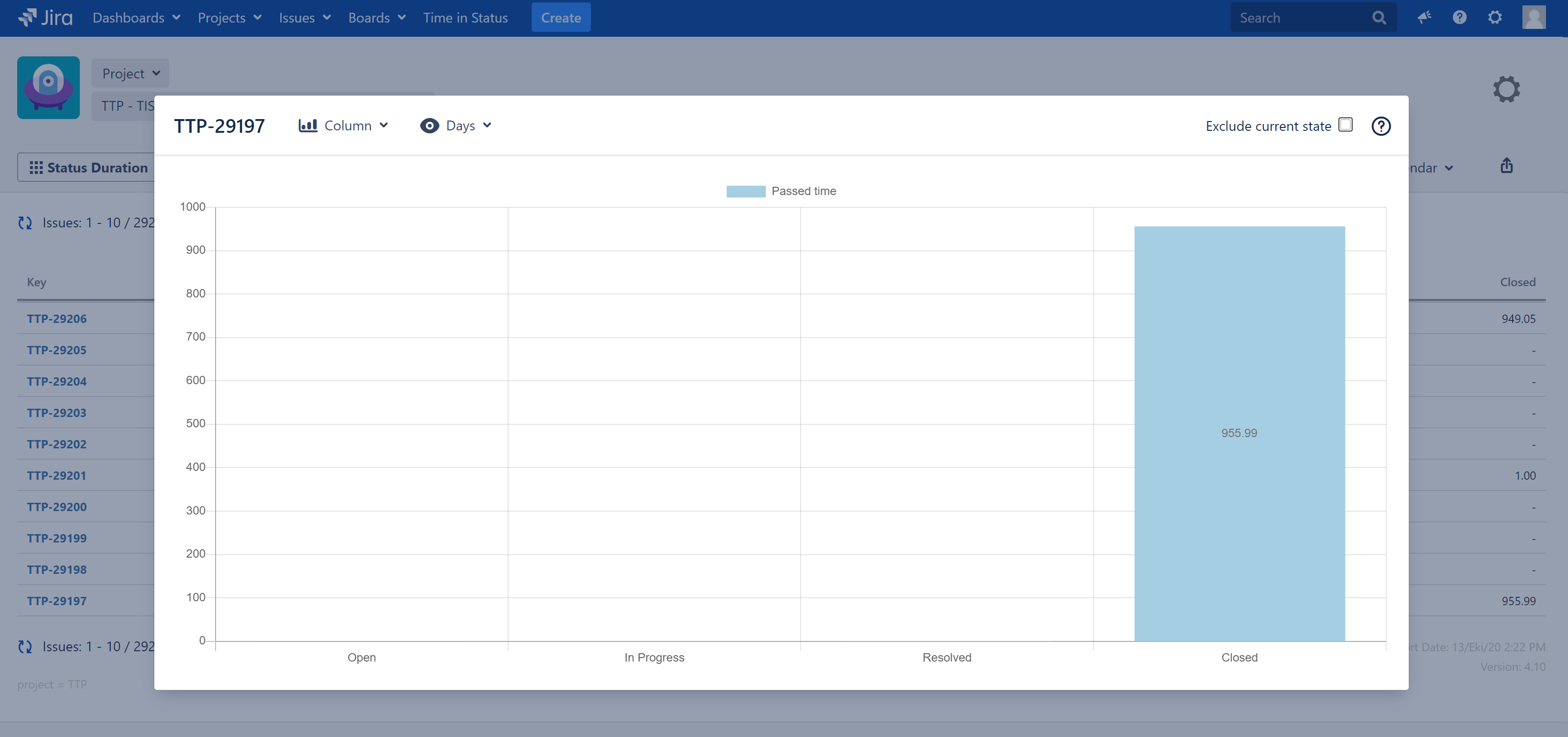 Please note that Exclude Current State does not exclude the latest status completely but rather excludes the duration since the latest status/assignee change in issue history. If the issue has visited Closed status more than once, the Closed column will still display a value grater than zero when Exclude Current State is checked.