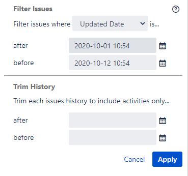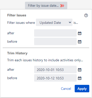 Once again you select the beginning and/or end dates (after/before dates) for the trim. Trim History causes the history of each issue in the report to be trimmed down to include only the activities between given dates. It will be as if the issue was created at the trim beginning date (with the data the issue contained at that moment) and ceased to exist at the trim end date.