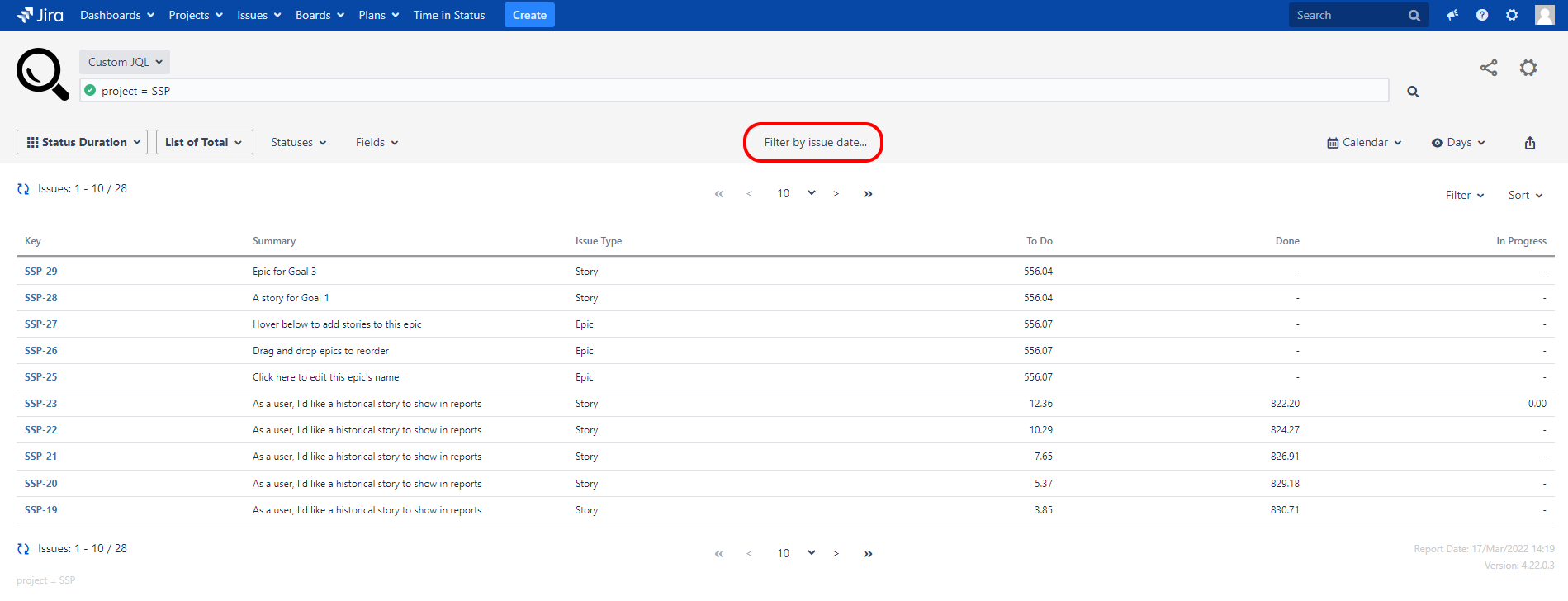 This feature is particularly useful when your issues have long lifespans but for a particular Time in Status report, you are interested in what happened to those issues between two specific dates.