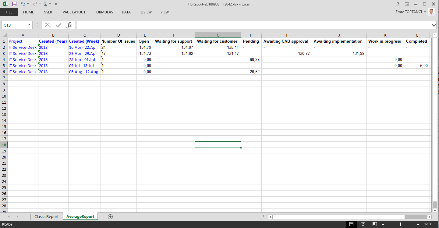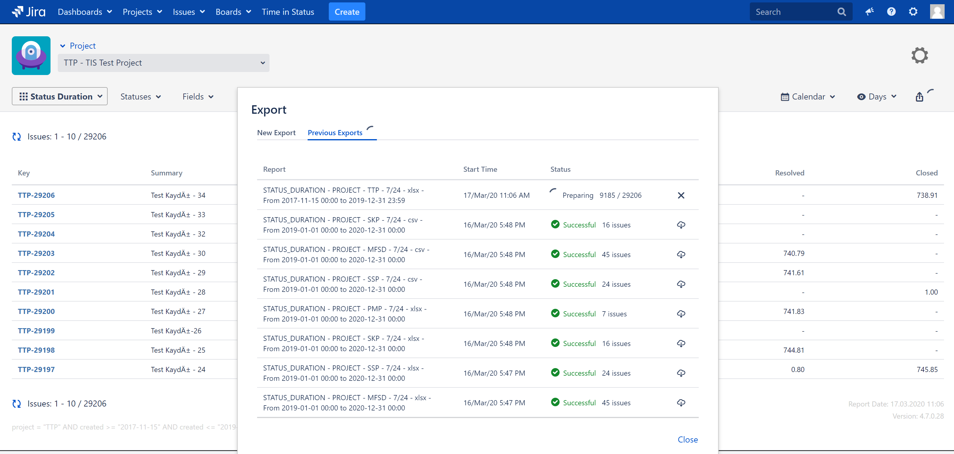You can also pull data from Time in Status REST API directly into your spreadsheet to automate reporting. For details, see: TiS Server and Data Center - Sample Spreadsheet Integration Files