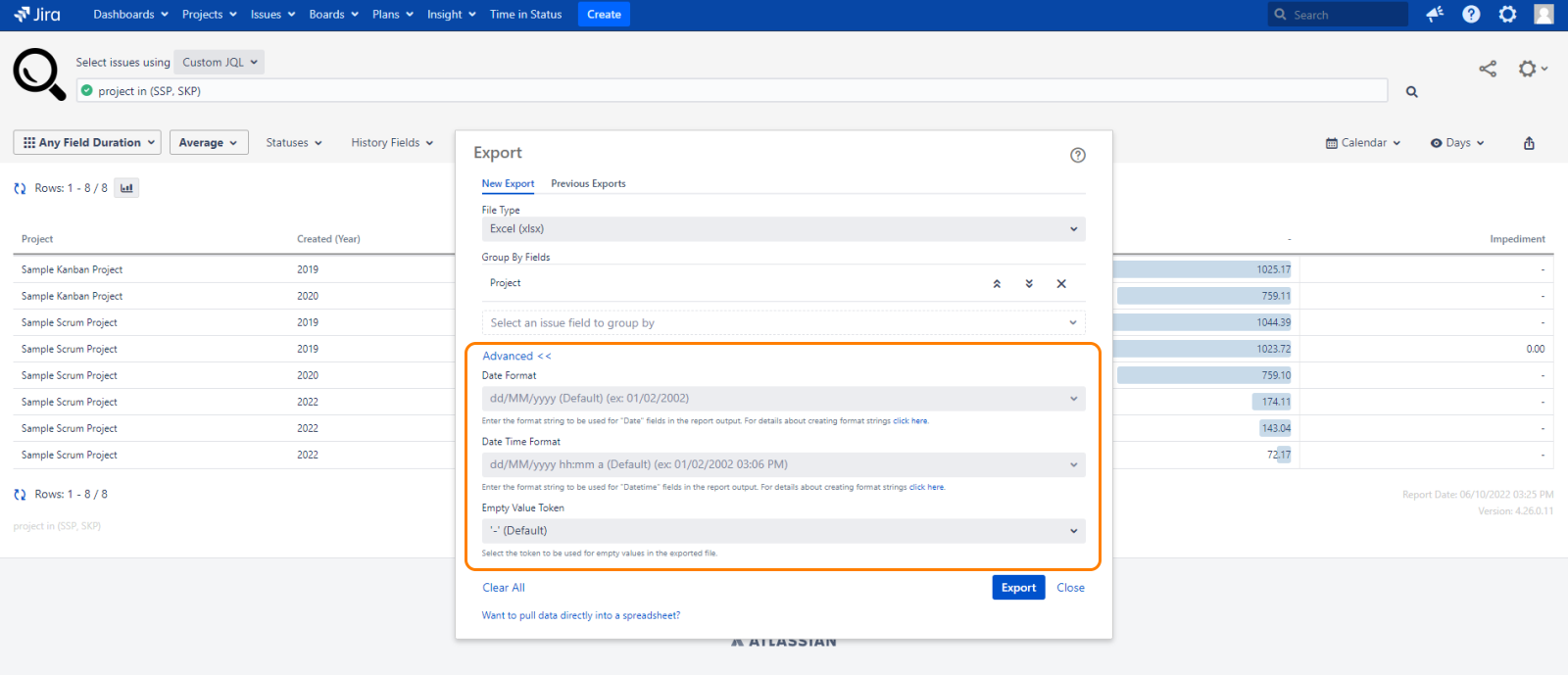 You can also define an Empty Value Token here. Empty values in the report (for example, if an issue has never visited a status) will be represented by this token. The default value is a Hyphen ("-"). You may select one of the other options based on how you plan to use the exported file.