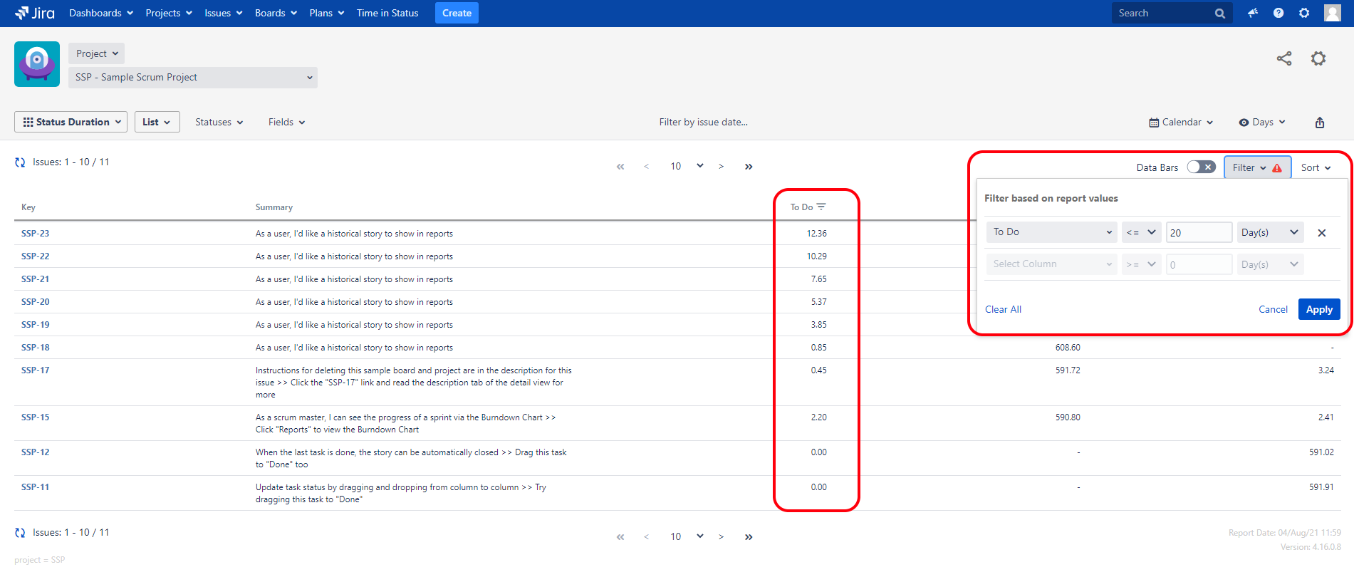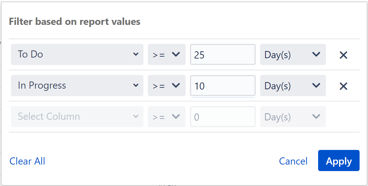 For some supported report types, Time in Status allows filtering the report output by the calculated report values.