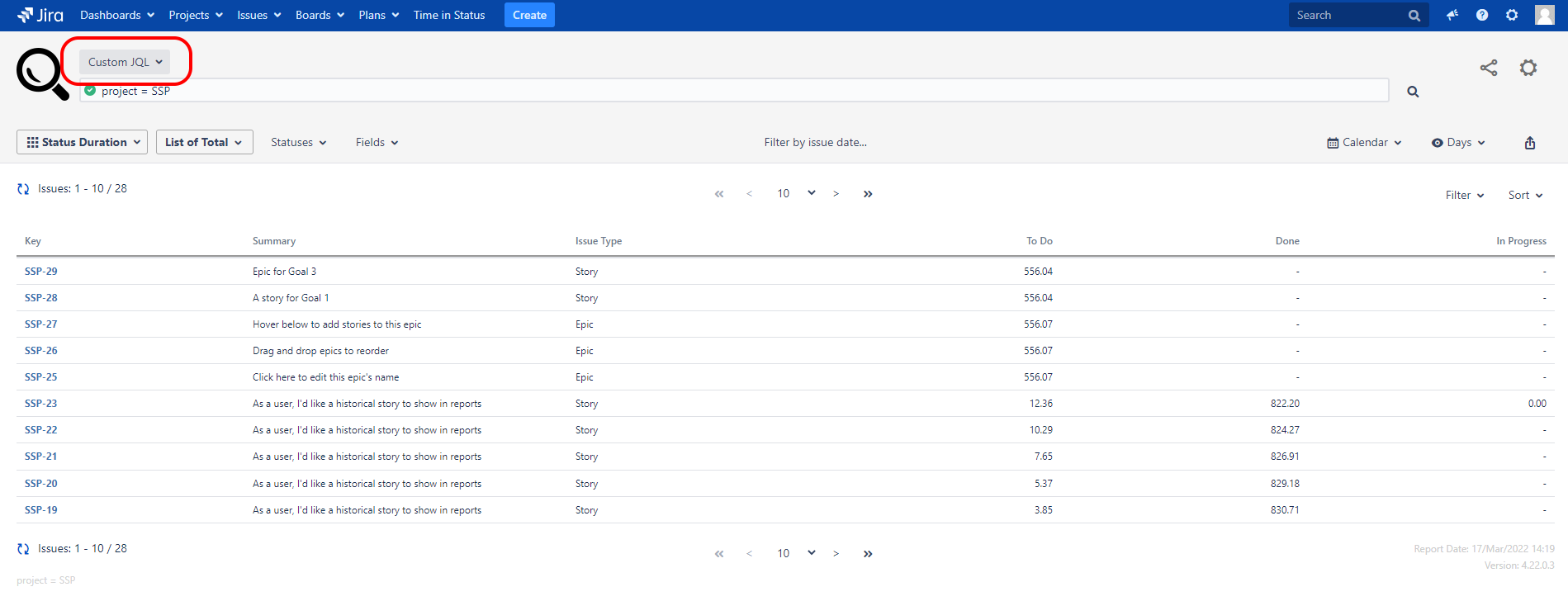 Custom JQL type reports filter issues based on a JQL filter that you enter through the page. When this option is selected, a textbox appears that you can enter a JQL Query.