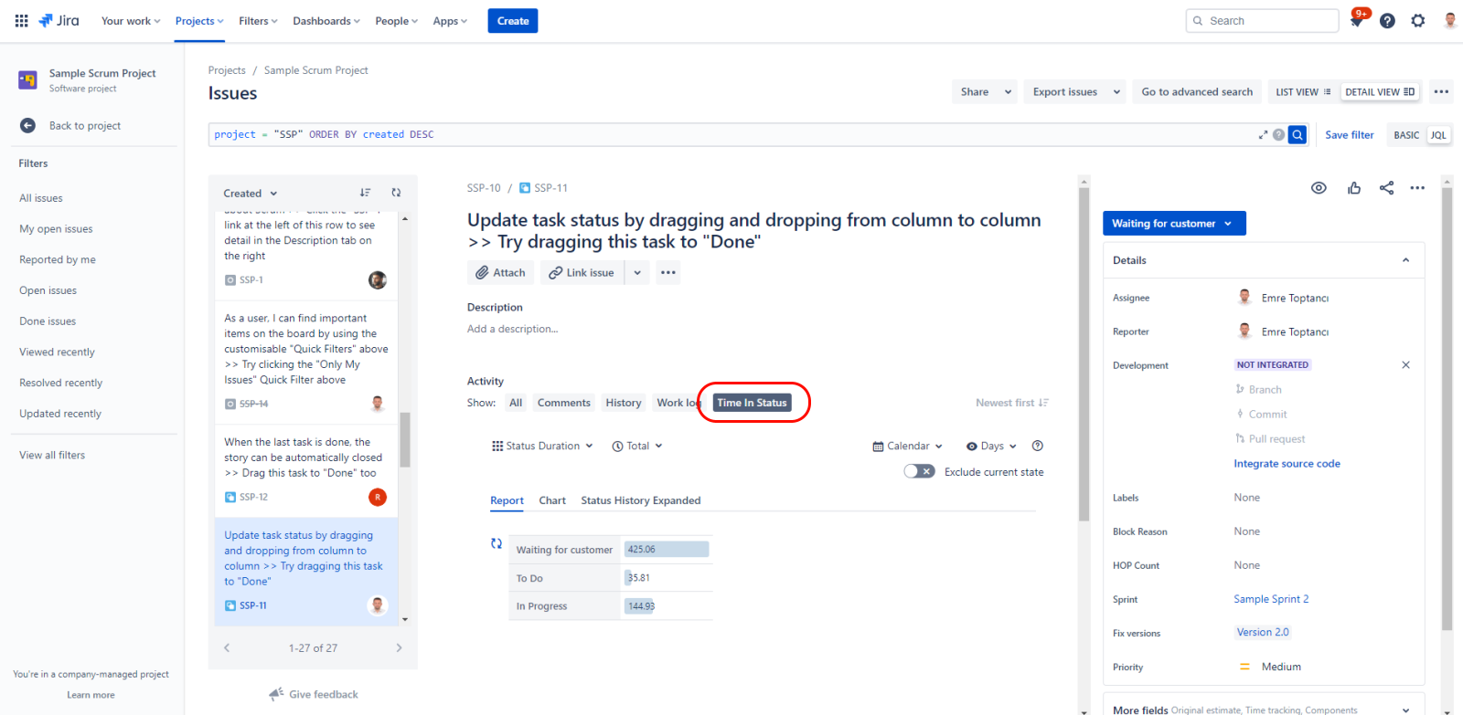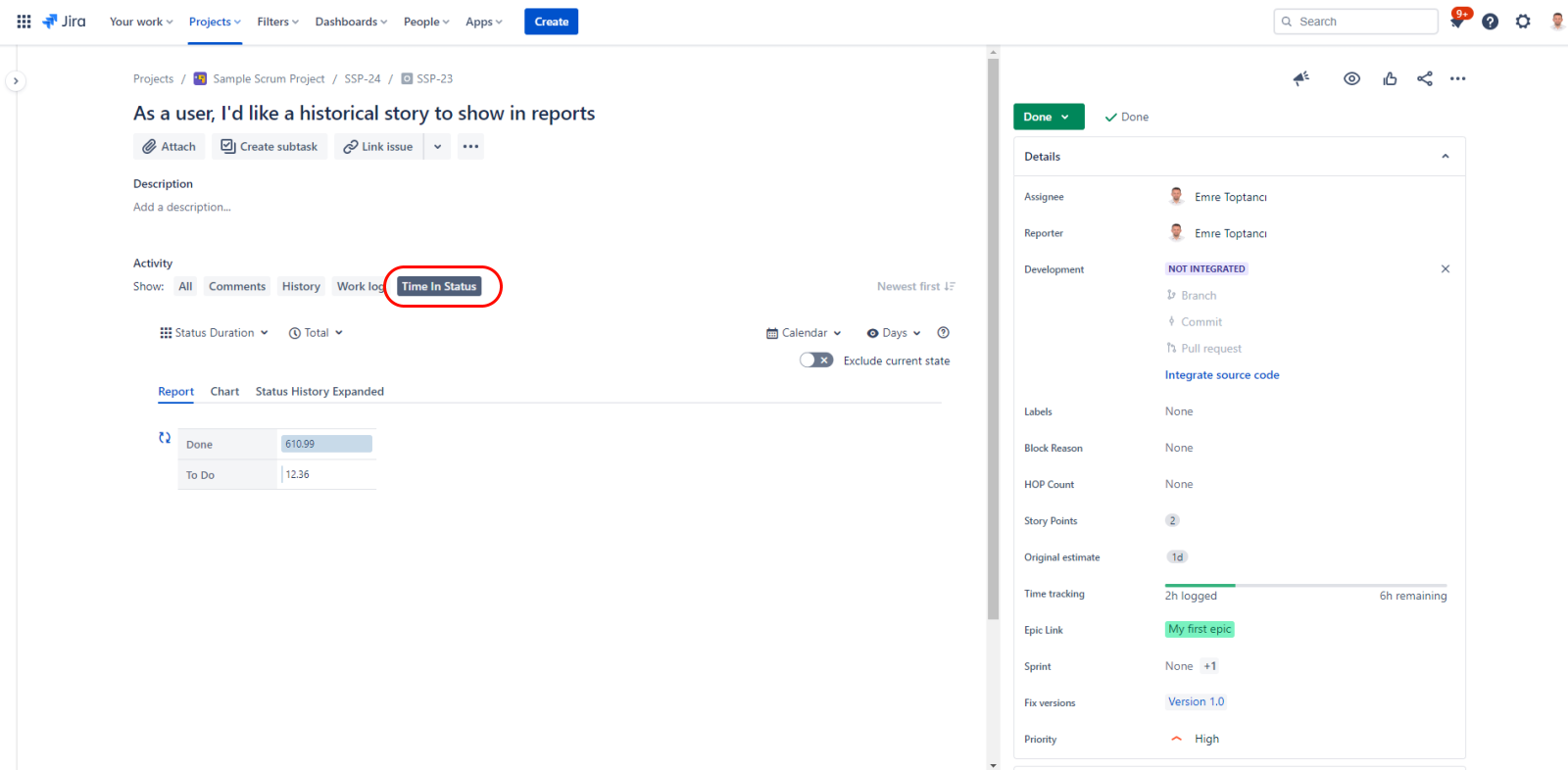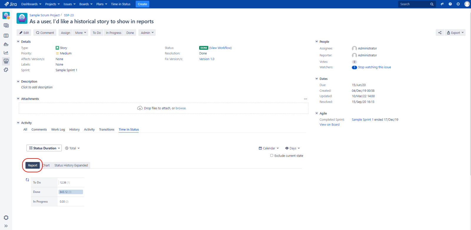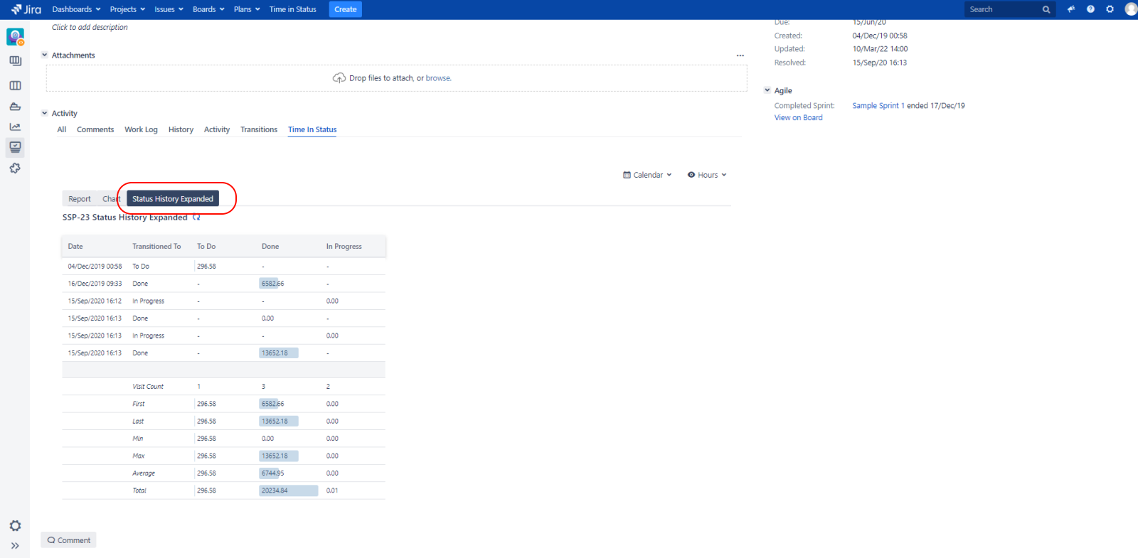 The Status History Expanded Tab displays for the issue, the report with the same name.