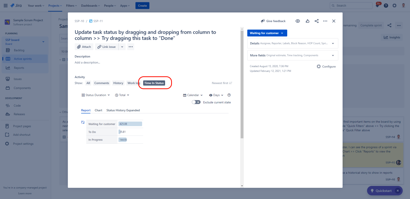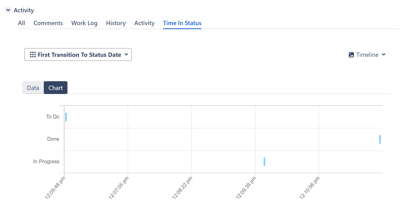 The Time in Status tab is available at multiple locations where a Jira issue is displayed. This tab shows Time in Status data for a single issue.