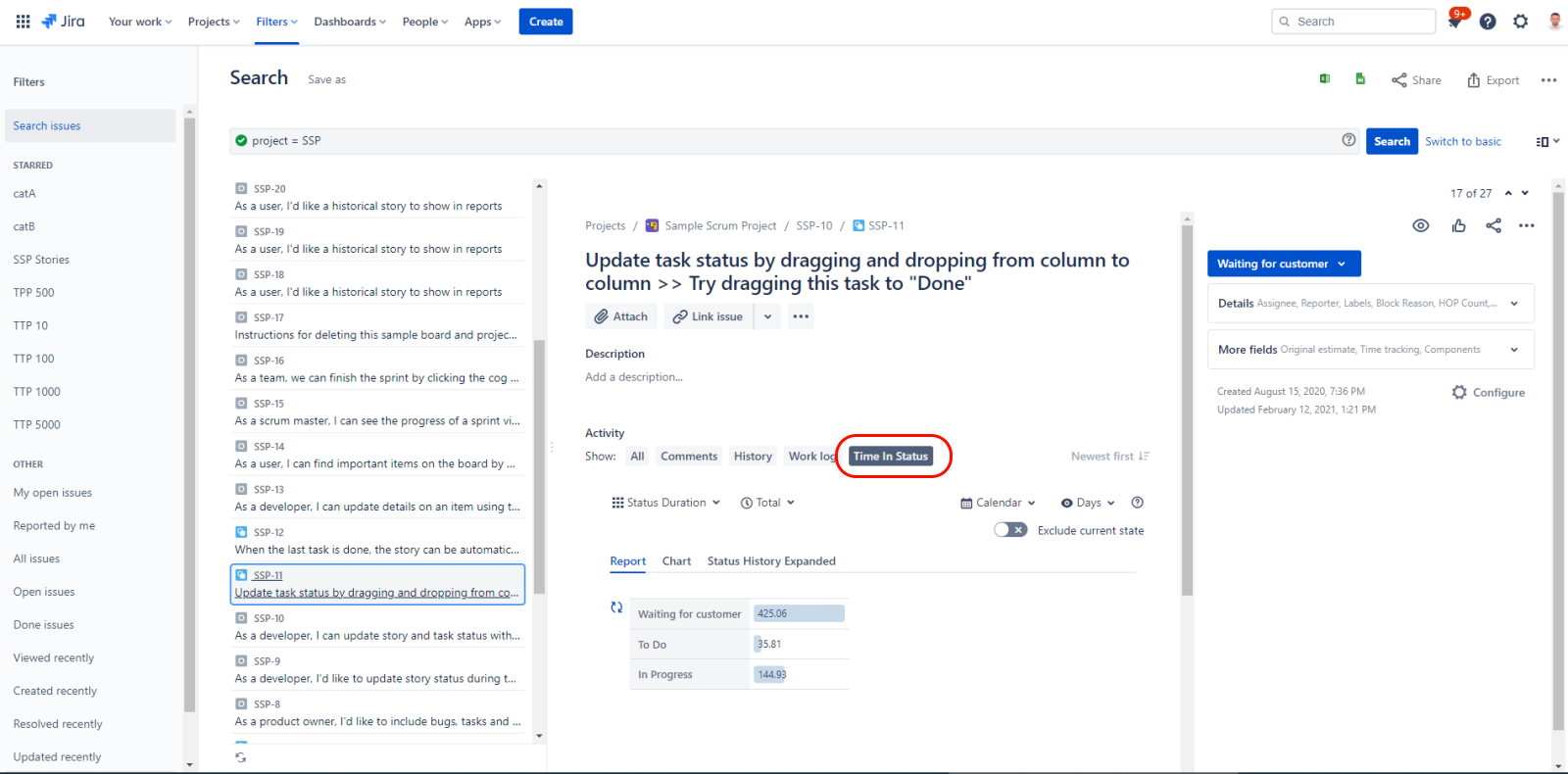 There are multiple sub-tabs that are visible under Time in Status tab.