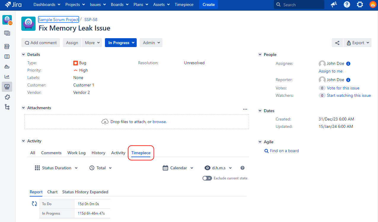 To access Timepiece data for a single issue, you can open the view screen of any Jira issue and you will see the Timepiece tab.