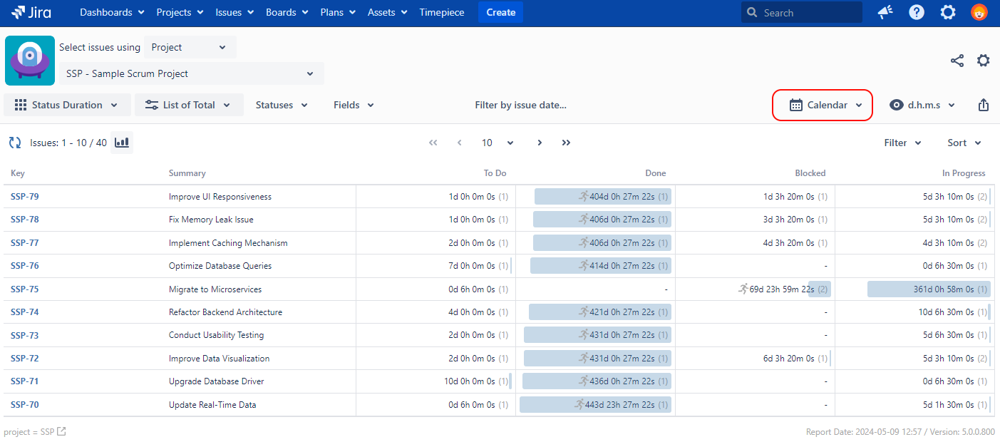By default, the business hours calendar is set to work from 09:00 - 17:00 and weekends are non-working days. If an issue was transitioned to "In Progress" on Friday at 16:00 and was transitioned to "Done" on Wednesday of next week at 16:00, different values will show for different calendar types and view formats. (See View Format section below about View Formats)
