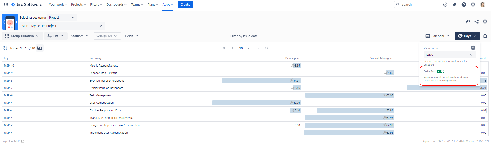 Data Bars are available for numeric report types and can be enabled using the switch with the same name on the toolbar.