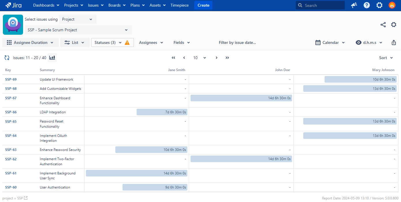 Status Duration per Assignee Report is a two level report that lists each issue in rows with user names and status names as columns and the time that issue spent on each status of each assignee as column values.