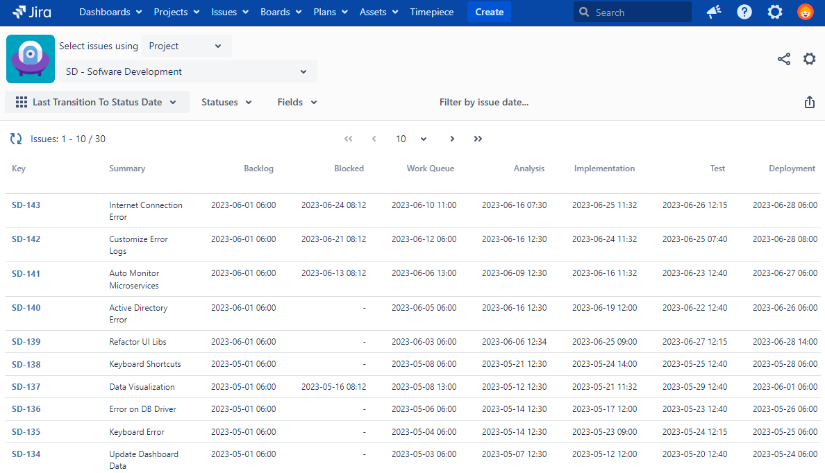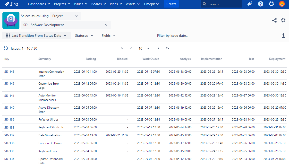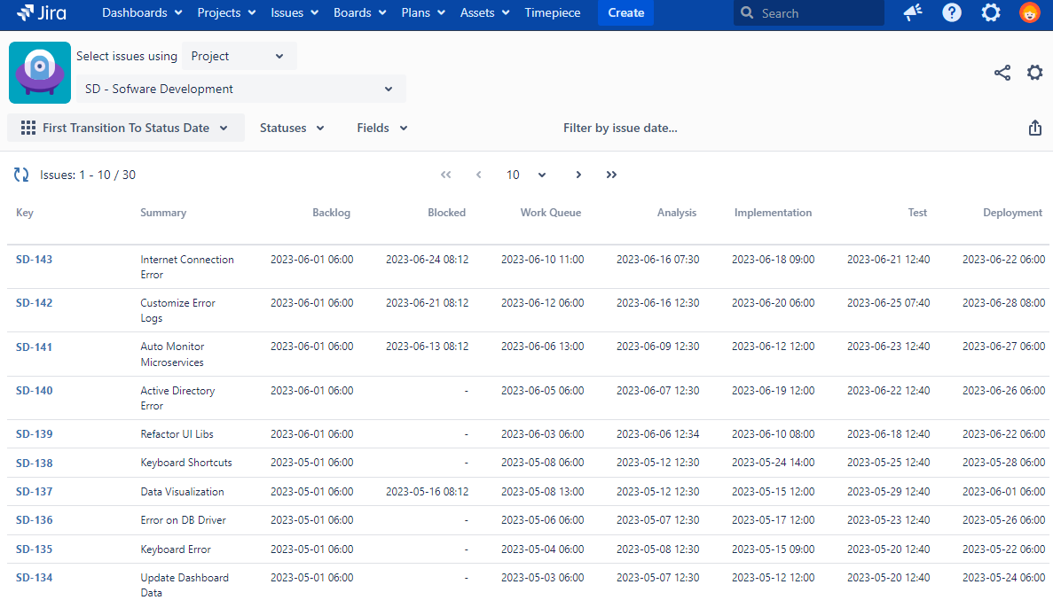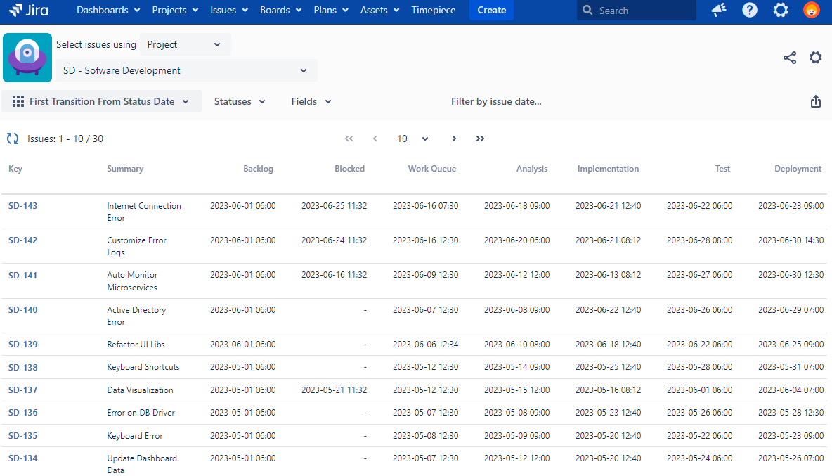 This reports helps you get the dates issues first left each status you can compare them with your own targets like resolution times, etc.