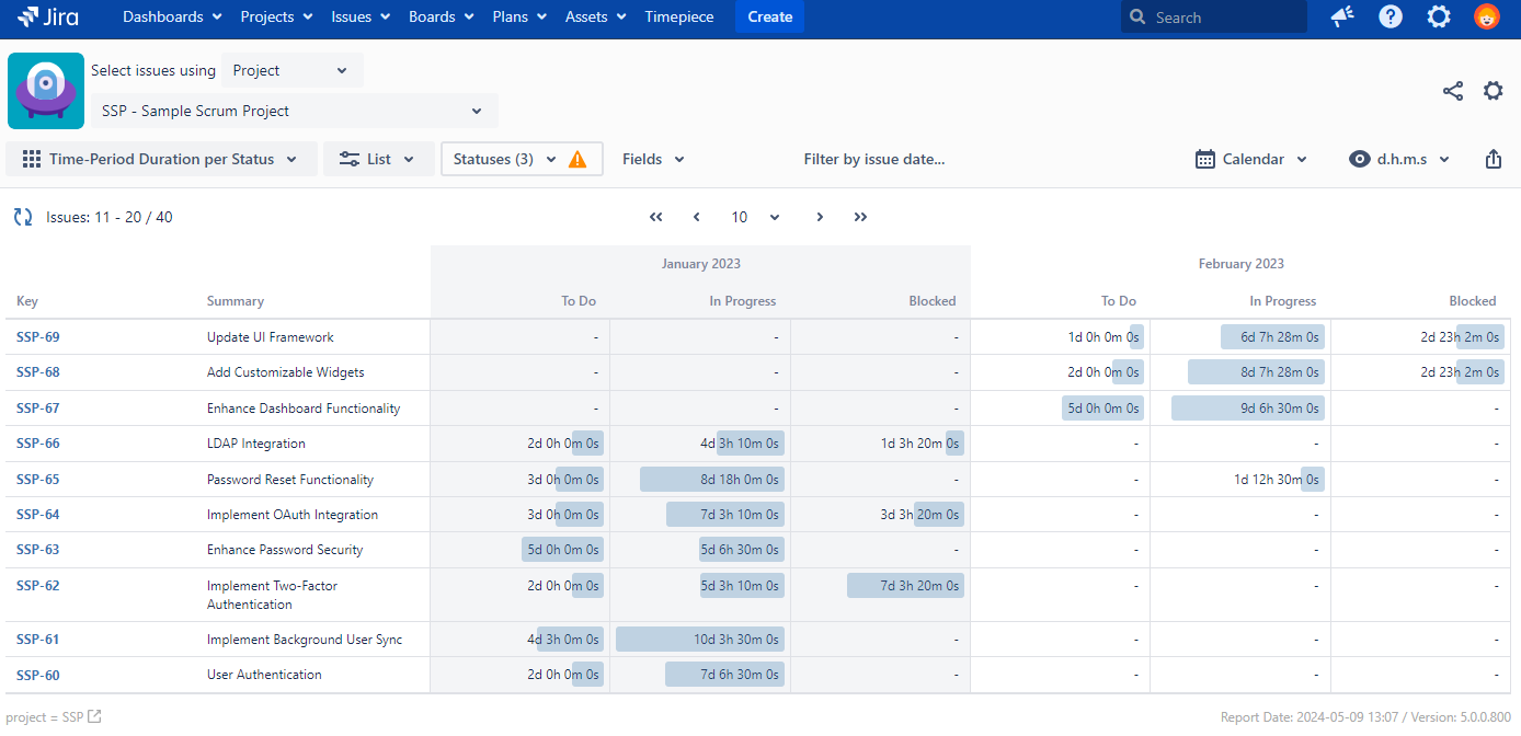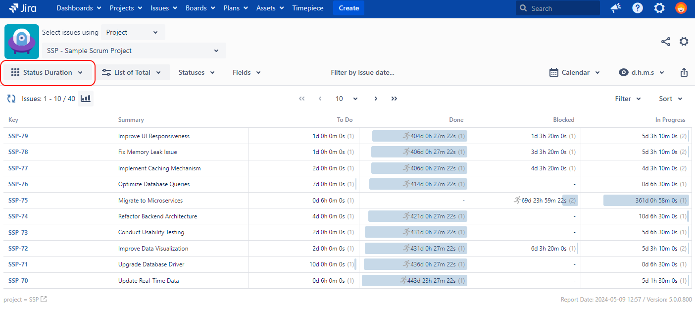 Status Duration in the older and the most commonly used of the report types. Status Duration Report lists each issue in rows with statuses as columns and the time that issue spent in that status as column values.