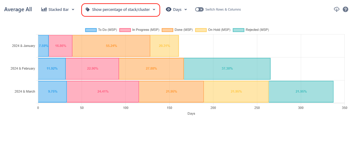If you choose the 'Show percentage of stack/cluster' option, each individual value is shown as its percentage with respect to the stack/cluster to which it belongs.