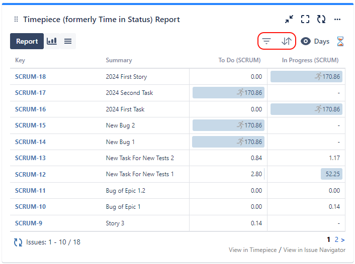 The Timepiece - Time in Status for Jira gadget allows you to display Timepiece reports as tables or charts on Jira dashboards.