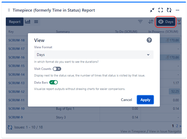 You can change the View Format (days, hours, minutes, etc.), enable/disable Data Bars, and show/hide Visit/Value Counts (for supported report types).