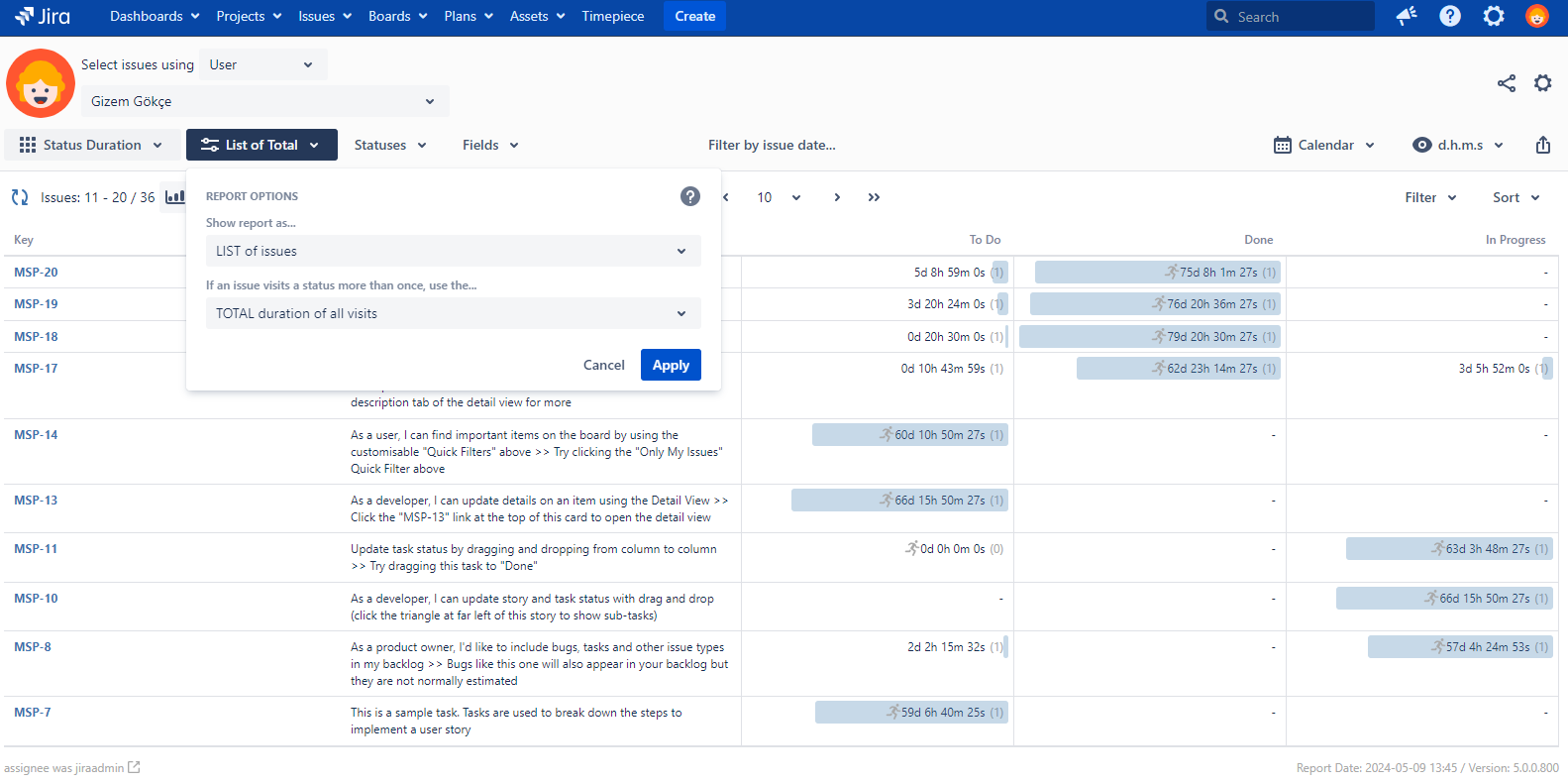 Timepiece - Time in Status for Jira allows you to create List reports or Aggregated reports. This is sometimes referred to as the "Report Sub-type" or "Report Options".