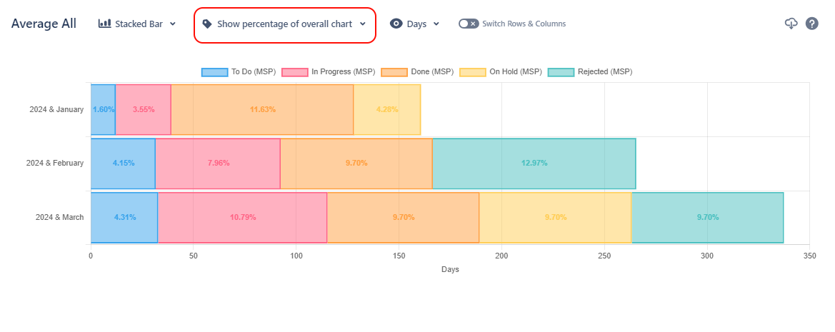 If you want to see percentage calculations in the charts,  Timepiece offers multiple options for this.