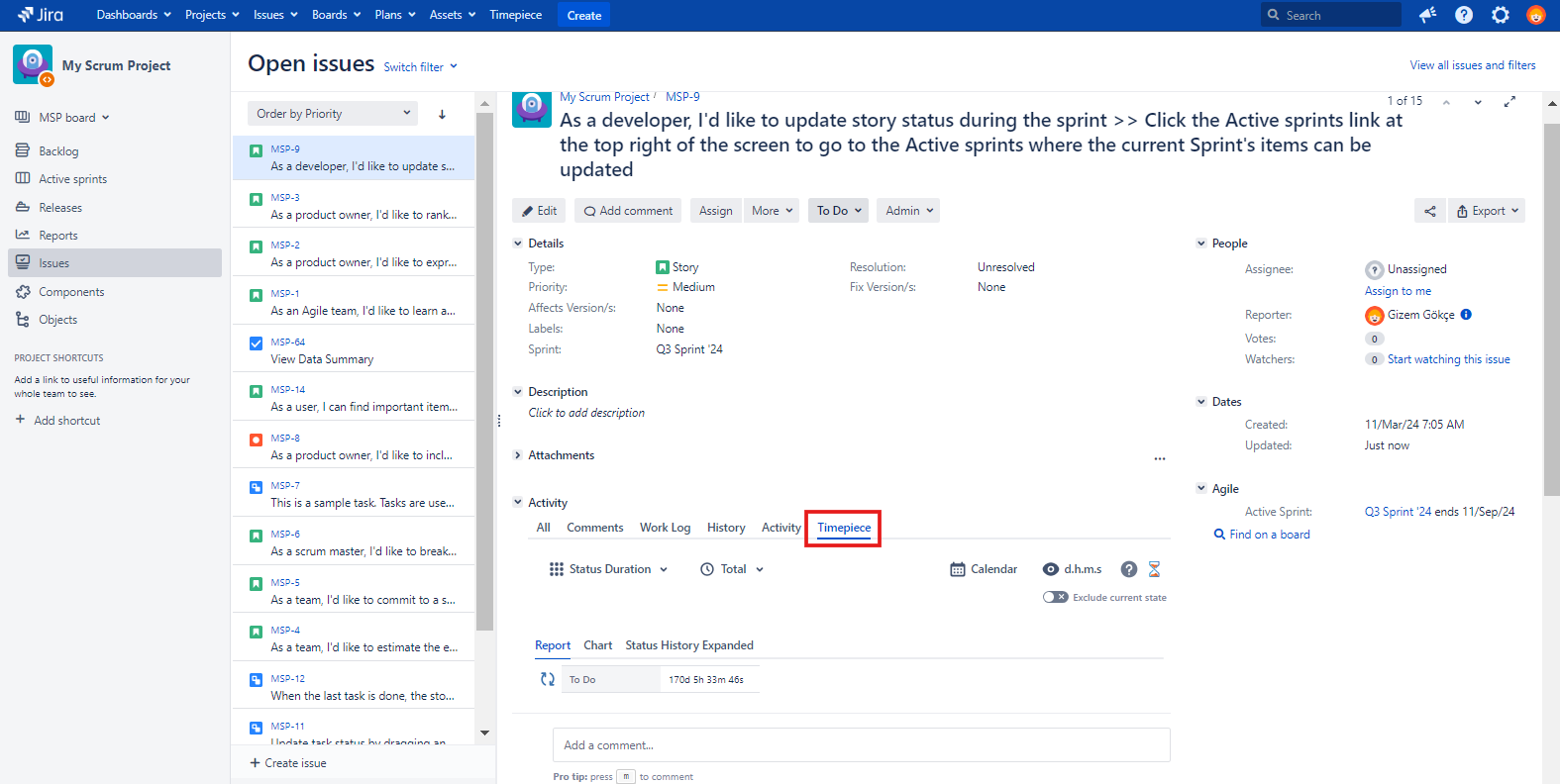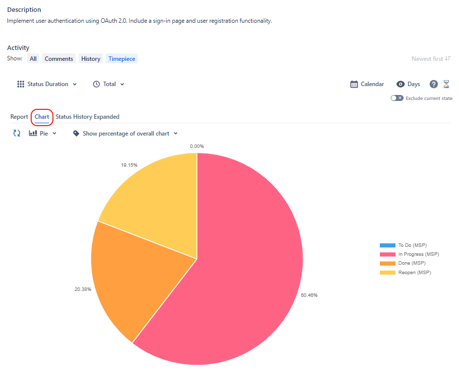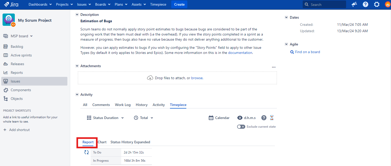 The Timepiece tab is available at multiple locations where a Jira issue is displayed. This tab shows Timepiece data for a single issue.