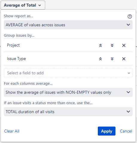 For example if you don't select and fields for group by when getting an Average report, the report will show you the overall average for all issues in the report. If you select the Issue Type field as the group by field for an average report, the issues in the report will be grouped by Issue Type and the report will show the average values for each issue type. The output will have a separate row for each issue type.