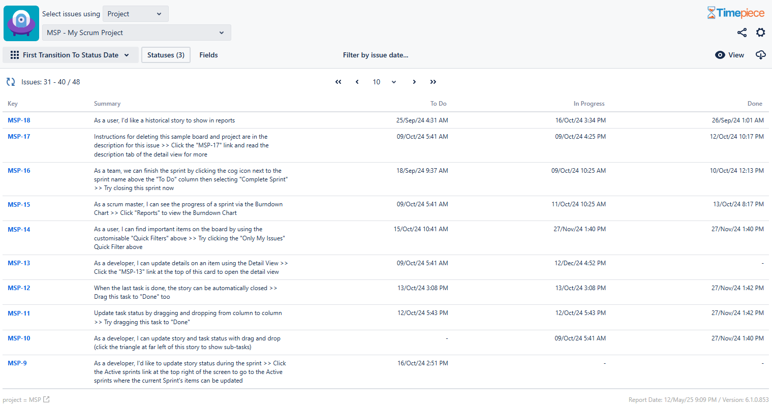 First Transition To Status Date Report shows status names as columns and the FIRST date each issue transitioned TO that status as column values.