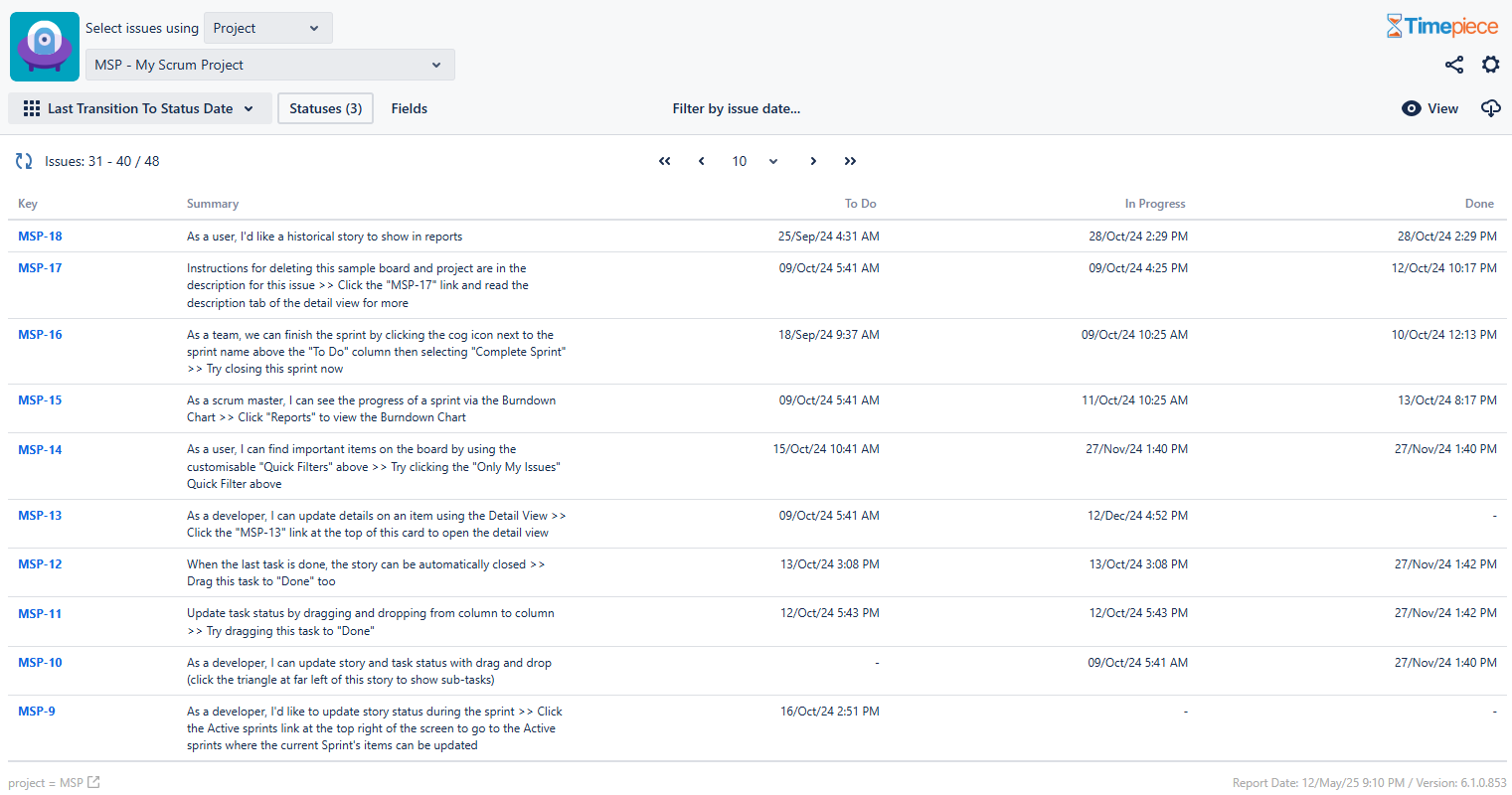This reports helps you get the latest dates when issues arrived to a given status so you can compare them with your own targets like resolution times, etc. Especially useful if issues go back and forth between statuses.