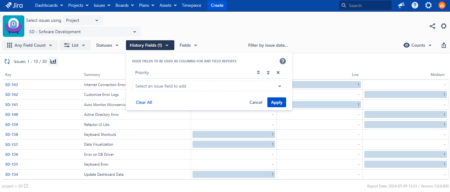 The report asks the user to pick at least 1 issue field and lists each issue in rows, possible values of the selected field as columns and the number of times each issue had that values as column values.
