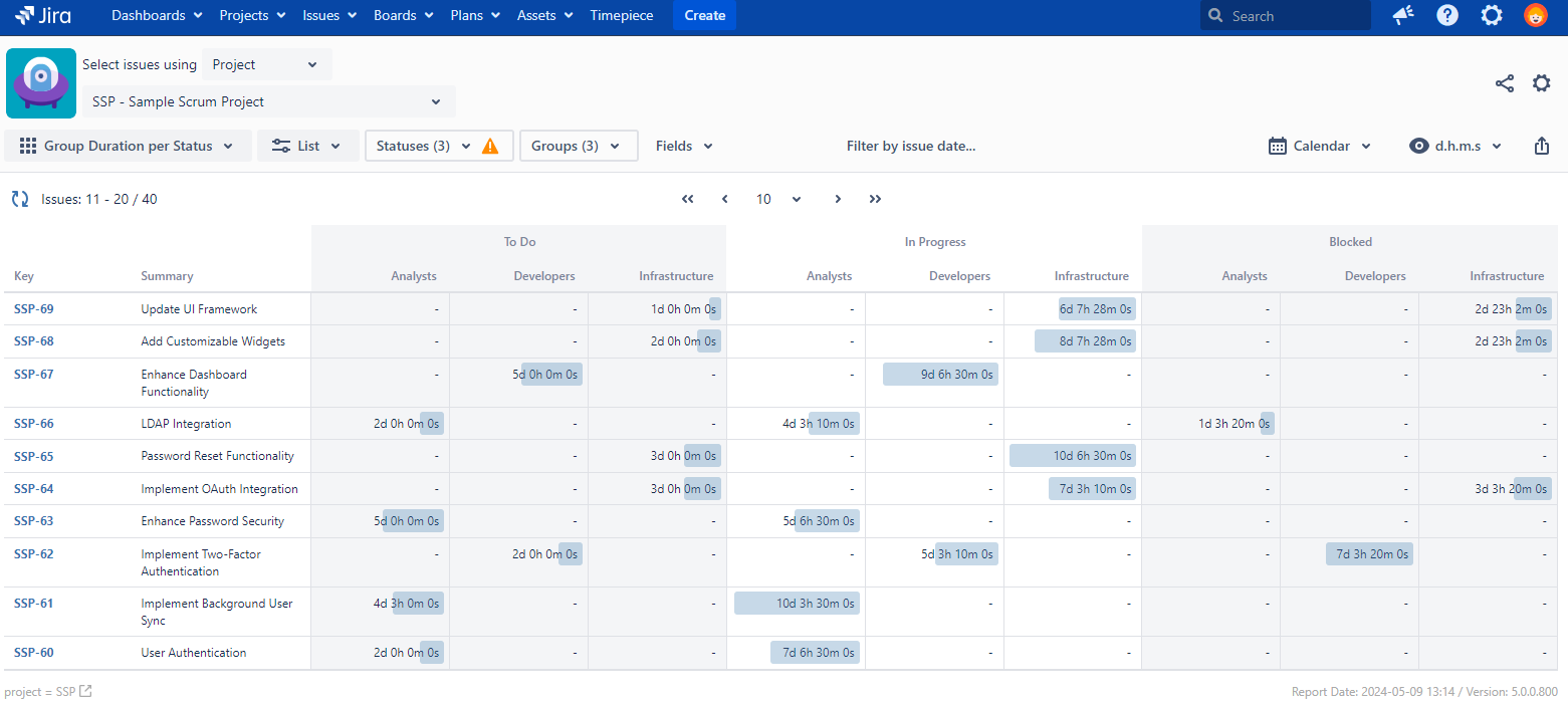 Status Duration per Group Report is a two level report that lists each issue in rows with user group names and status names as columns and the time that issue spent on each status of each user group as column values.