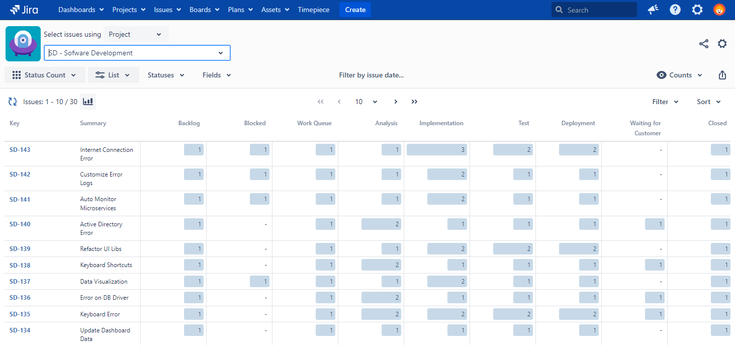 Status Count Report lists each issue in rows with statuses as columns and the number of times that status was visited as column values.