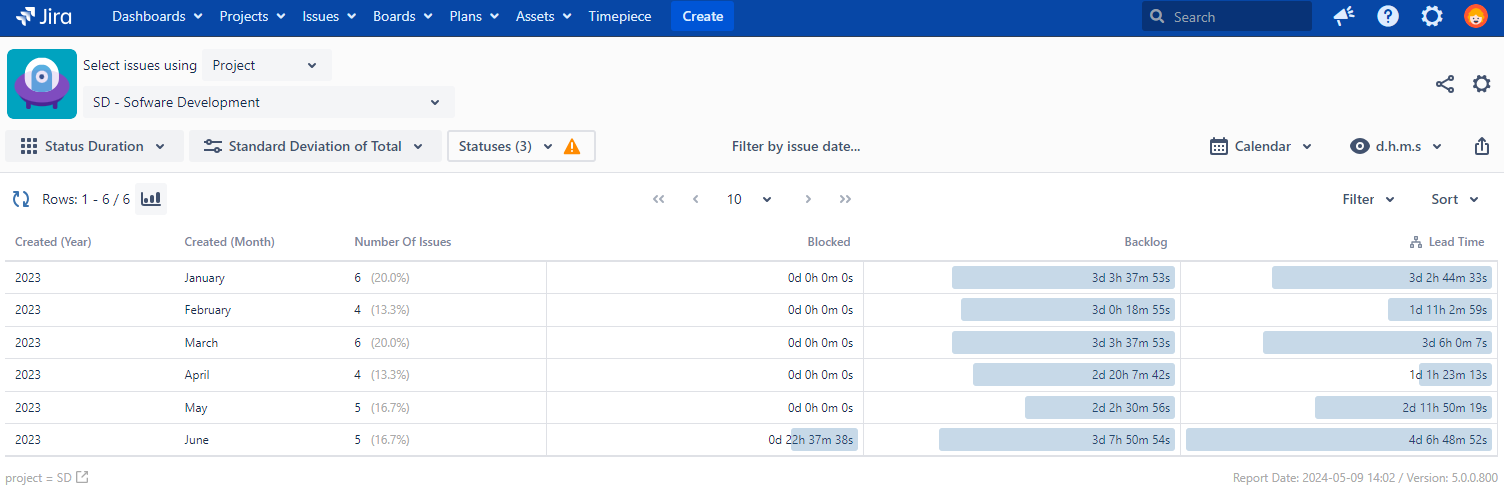 For Assignee Time reports, the report output shows assignee names as columns but the status selection, once again, defines the durations of which statuses to include in the report.