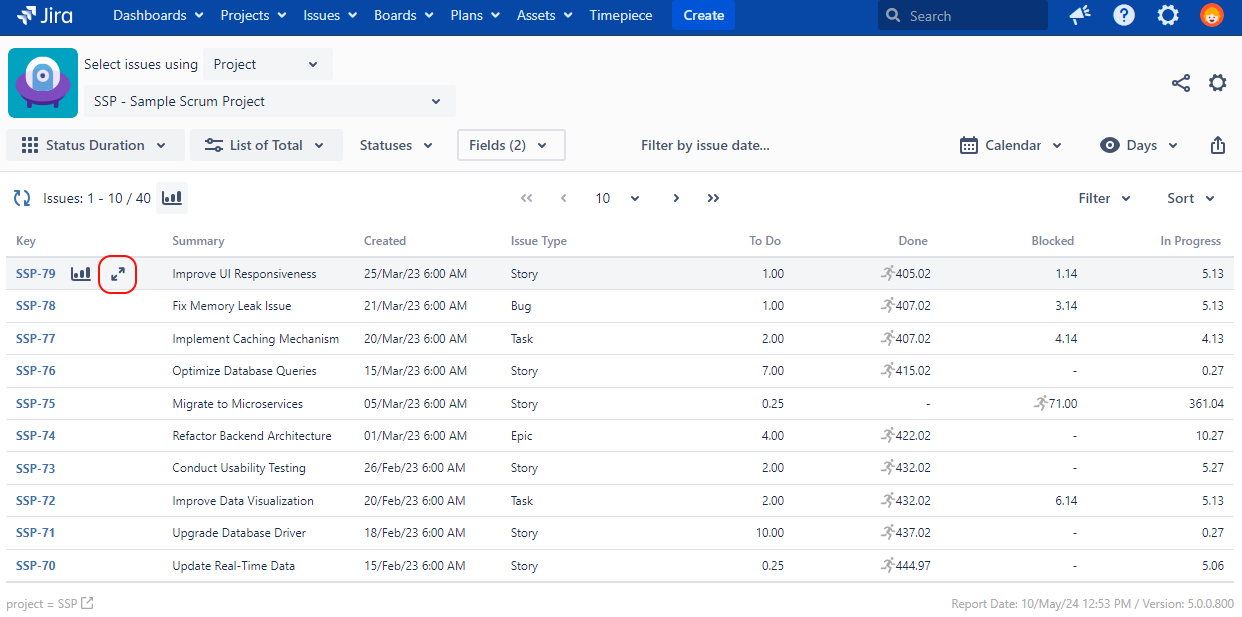 To access this report, you can use the "Status History Expanded" report button which is available on all status-based report types. The button becomes visible when you hover over an issue row with your mouse pointer.