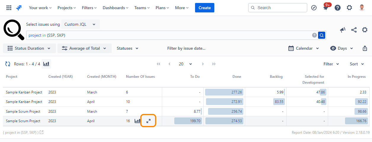 While working with Aggregate Reports (Average, Sum, Median, Standard Deviation), you can use the drill-down function on each report row to see the issues that made up that aggregate row.