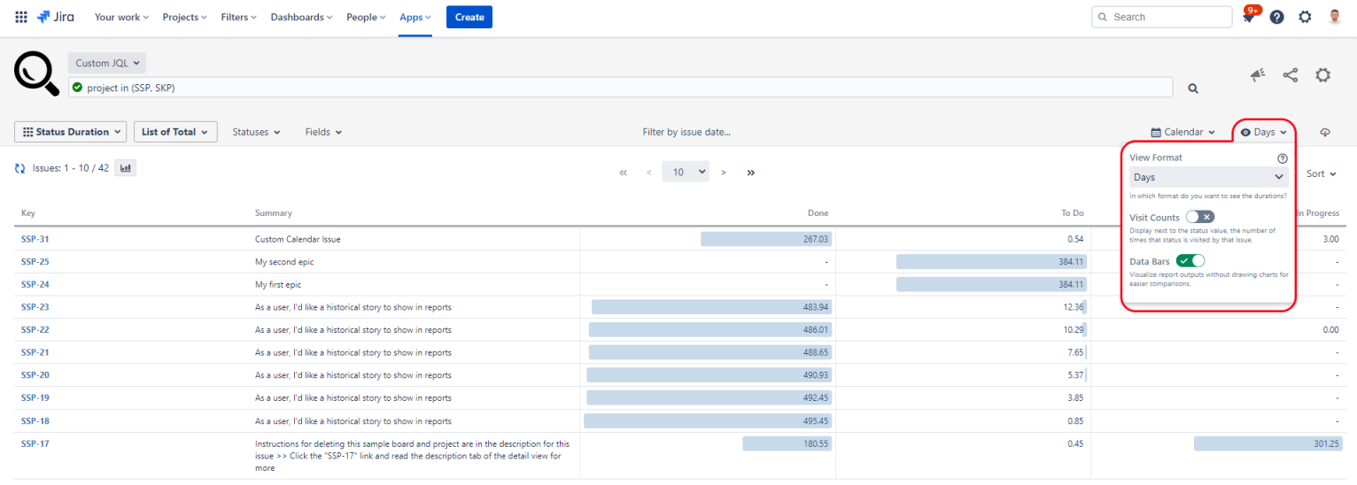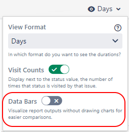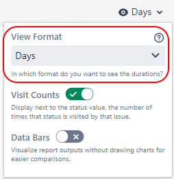 An issue might have visited a status multiple times. While reporting on the durations of those visits, it is often useful to also see how many times an issue visited each status. The Visit Counts option shows or hides the status visit number in the on-screen report output.
