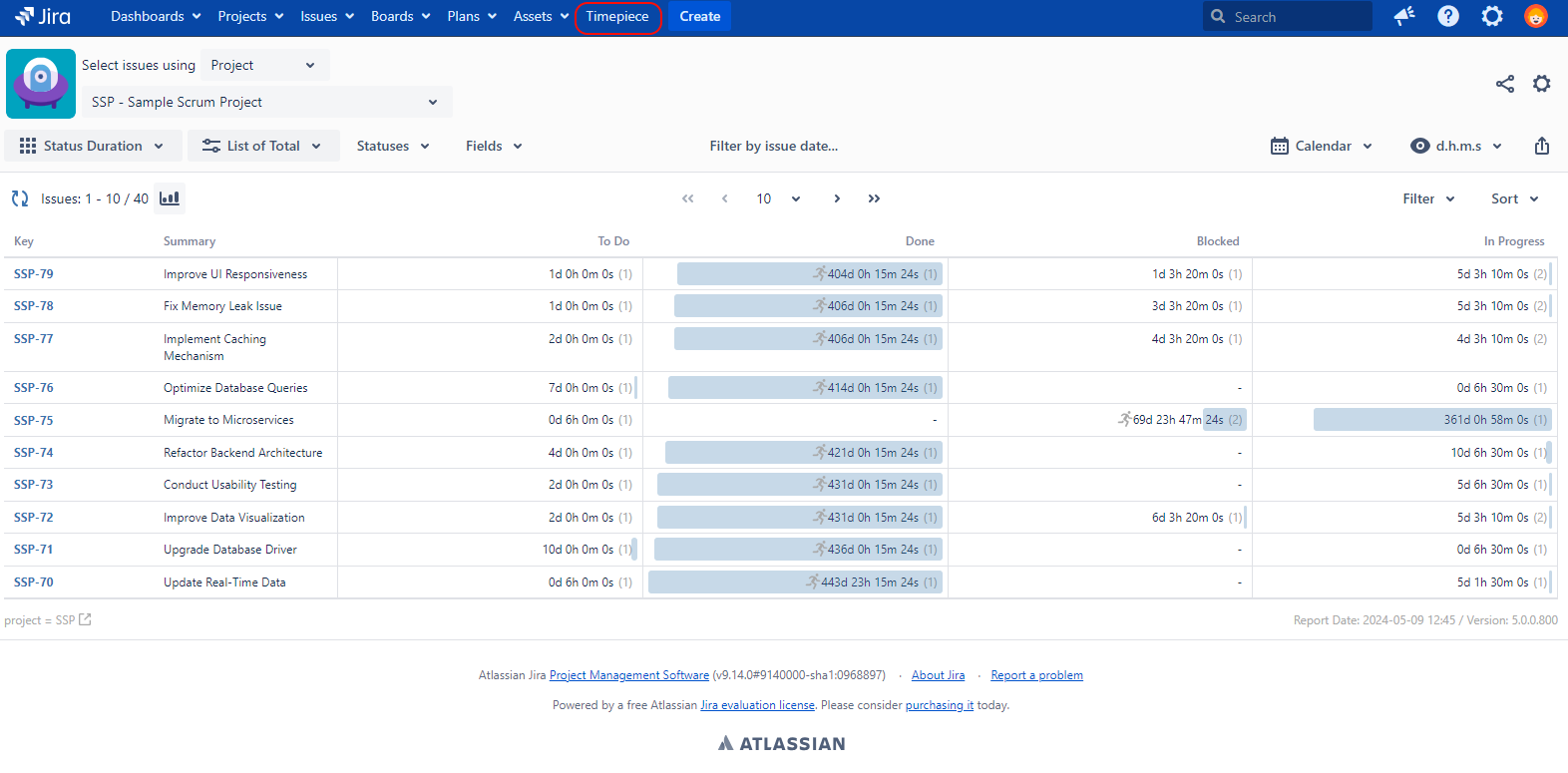 When installed, a new menu with the name Timepiece is added to Jira.
