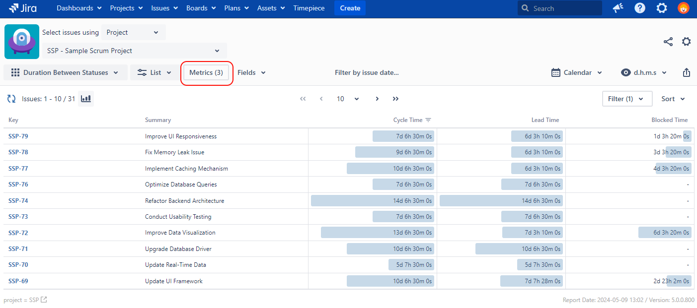 3. Paused: These are the metrics that reached the starting status, haven’t reached the stop status yet, but are in one of the “pause” statuses. The metric hasn’t stopped, but also is not counting at the moment. For these metrics, a value is displayed in the report, and next to the value, a pause icon is displayed to indicate that the metric is paused.