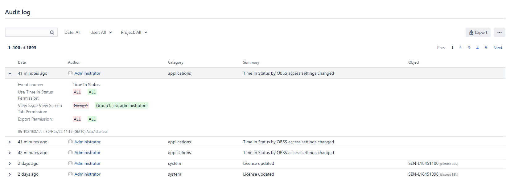 Any changes Timepiece Access Setting will be shown in Jira's Audit Logs.