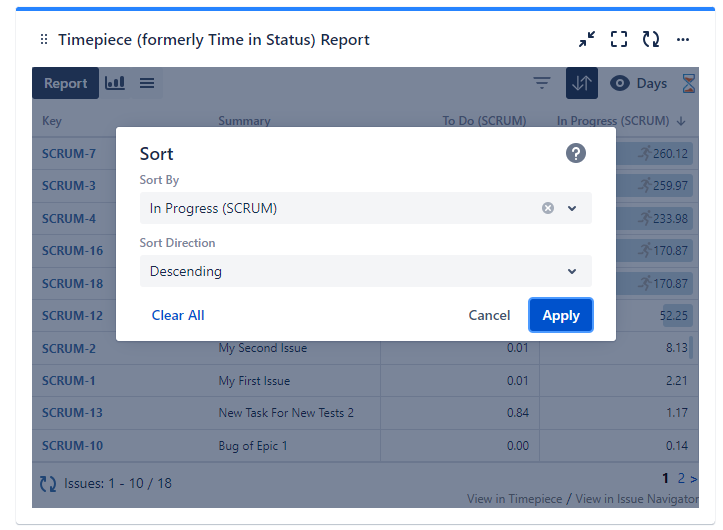The Timepiece - Time in Status for Jira gadget allows you to display Timepiece reports as tables or charts on Jira dashboards.