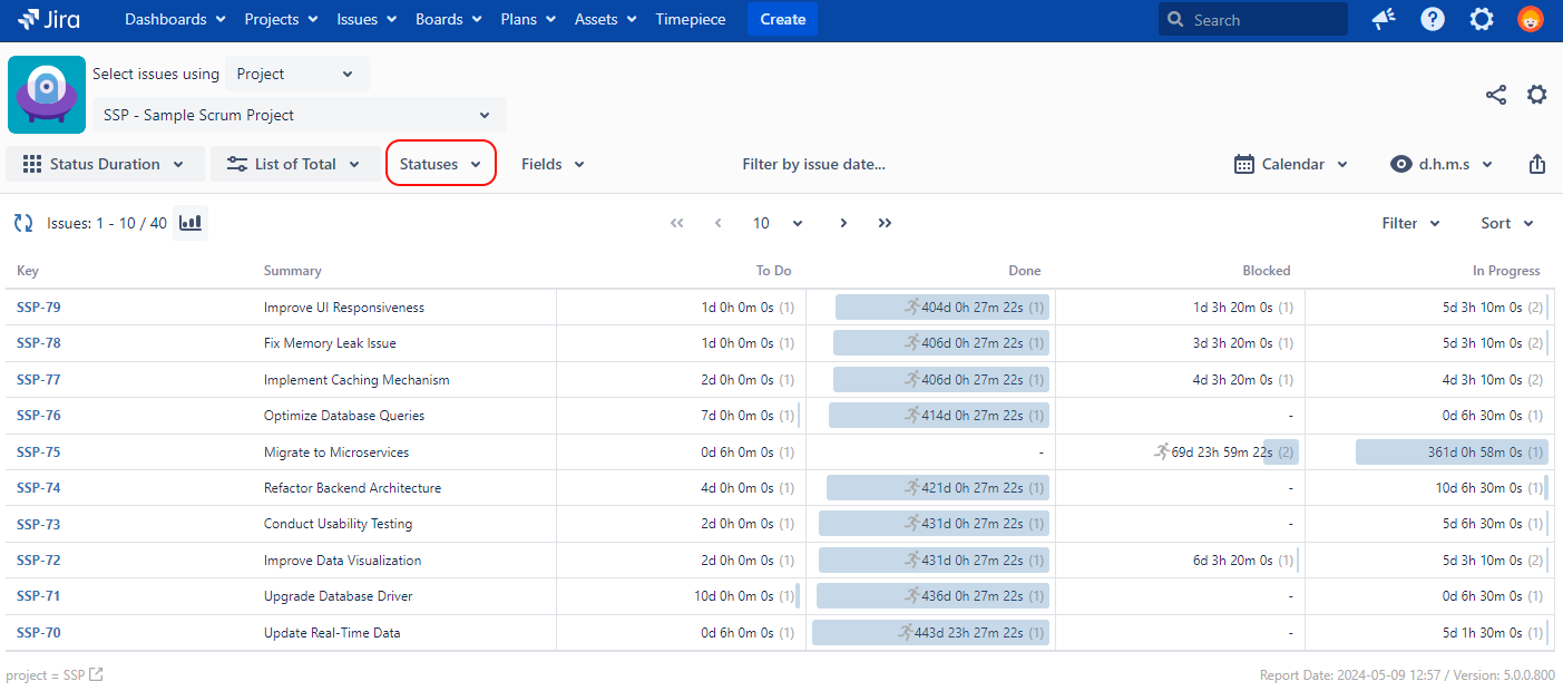 For Assignee Time reports, the report output shows assignee names as columns but the status selection, once again, defines the durations of which statuses to include in the report.